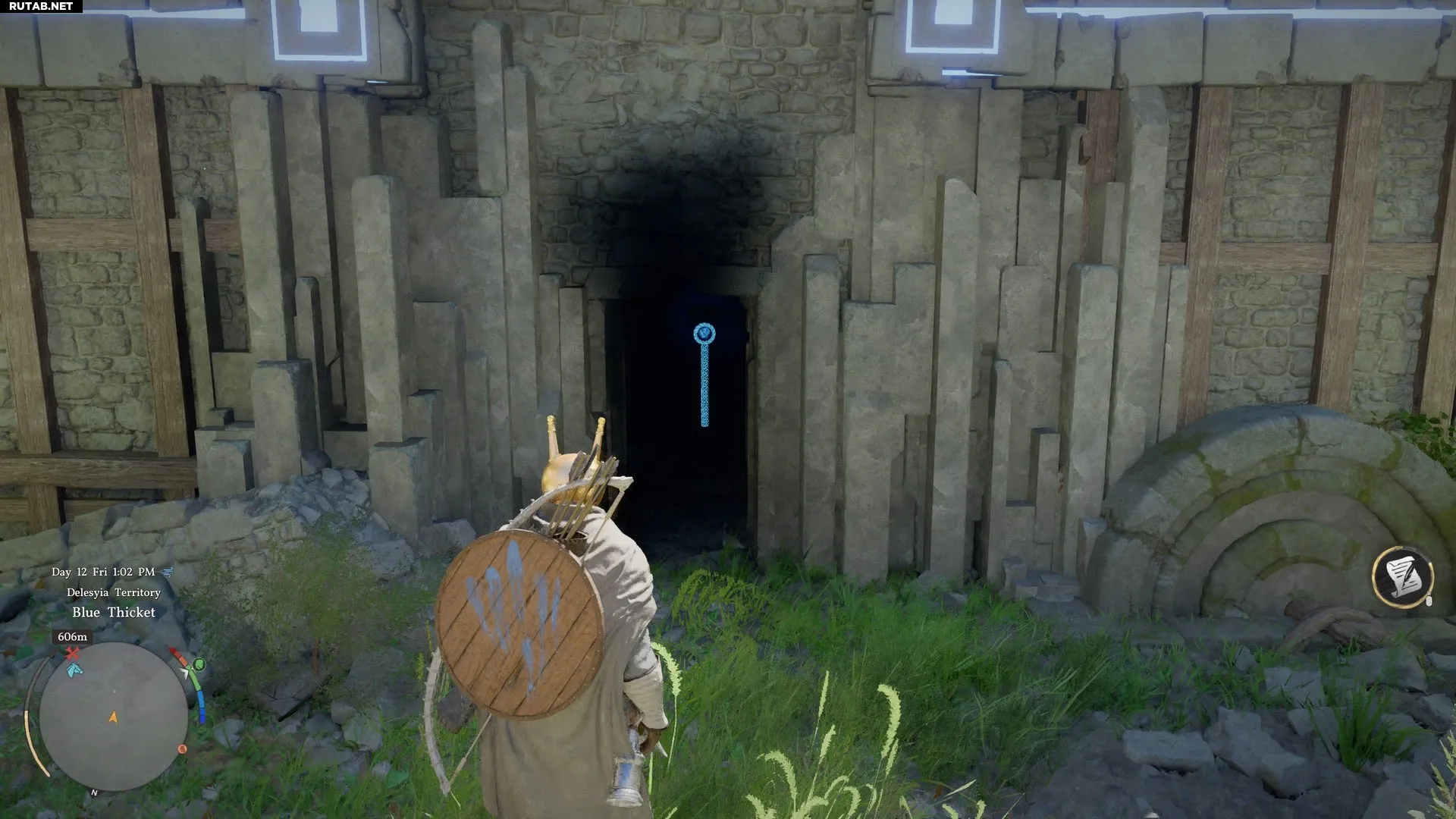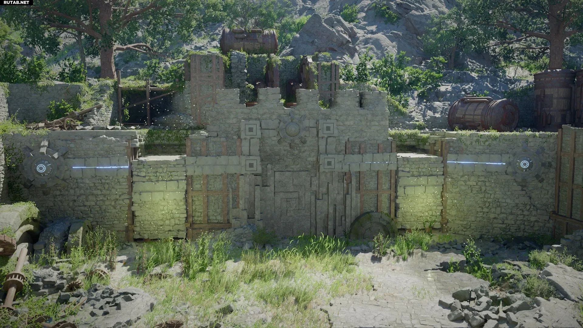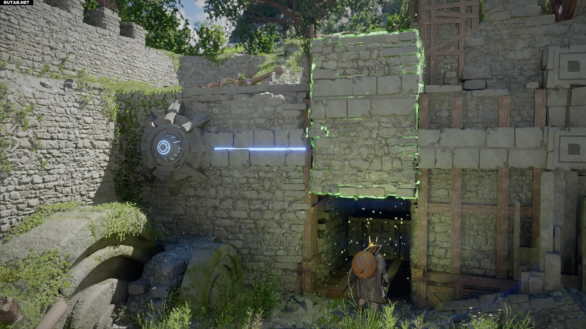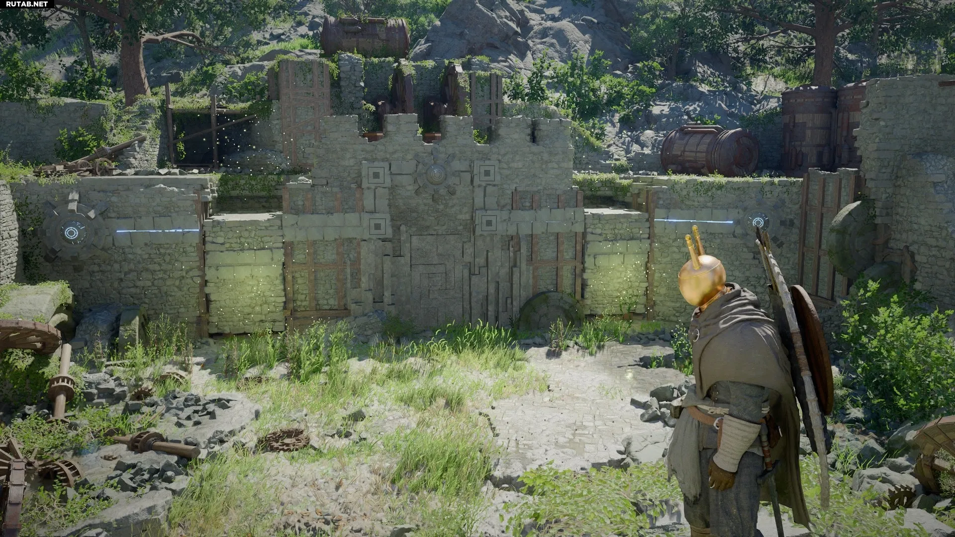 Прибыв в Руины Синей Чащи, вы обнаружите разрушенную крепость с различными механизмами. В первую очередь обратите внимание на два источника энергии, расположенных у южной стены руин.