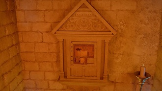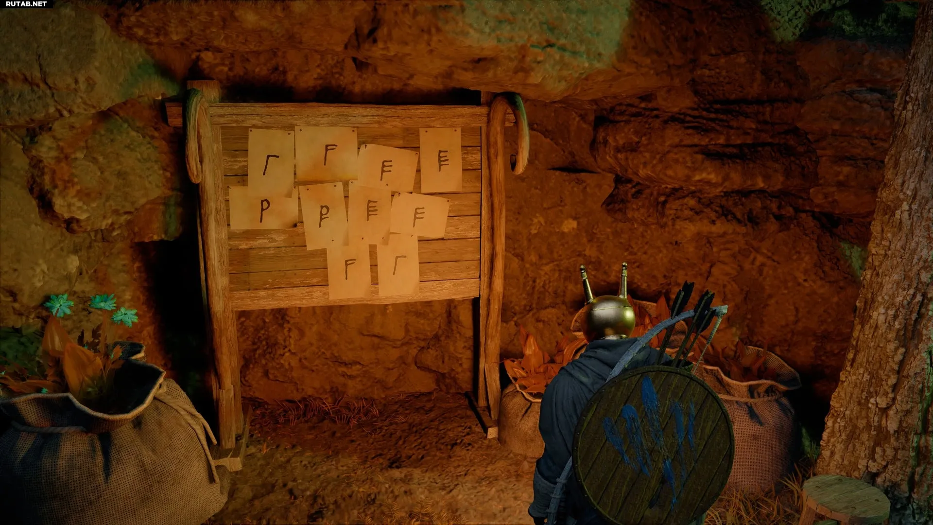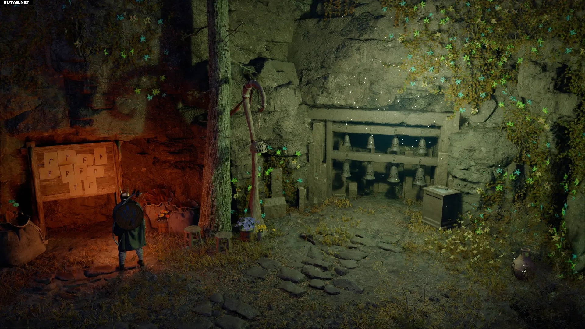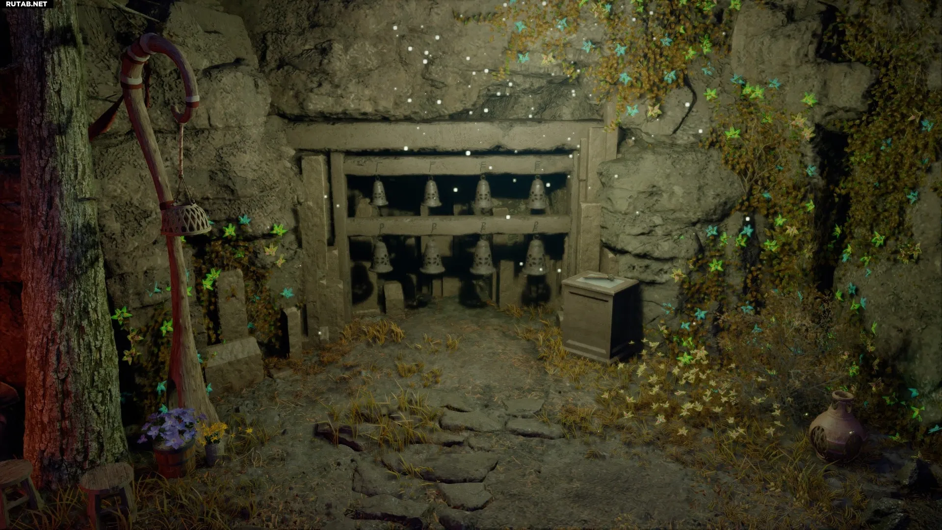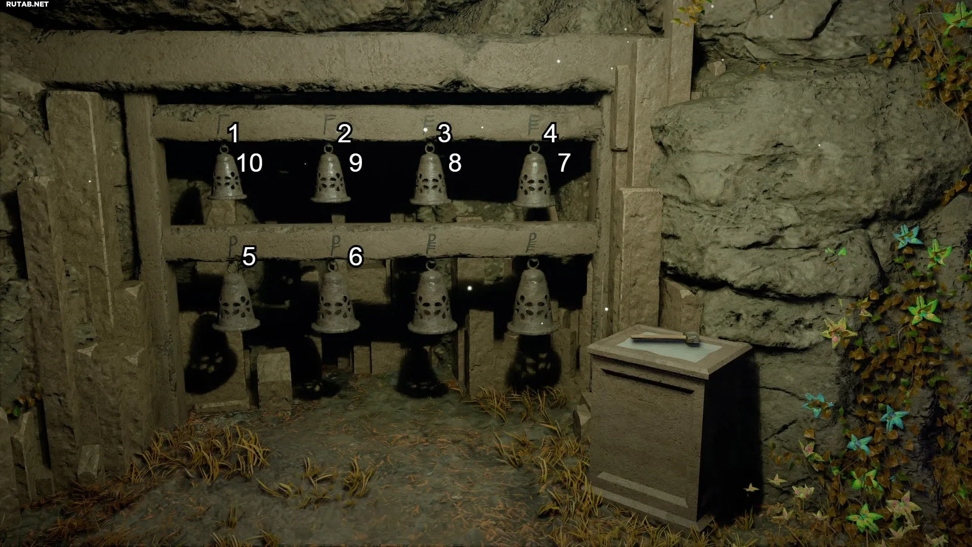 На локации вы найдете восемь колоколов, каждый с уникальным символом. Слева от них висит пробковая доска с листами бумаги, на которых изображены те же символы. Справа на каменном постаменте лежит маленький молоток.