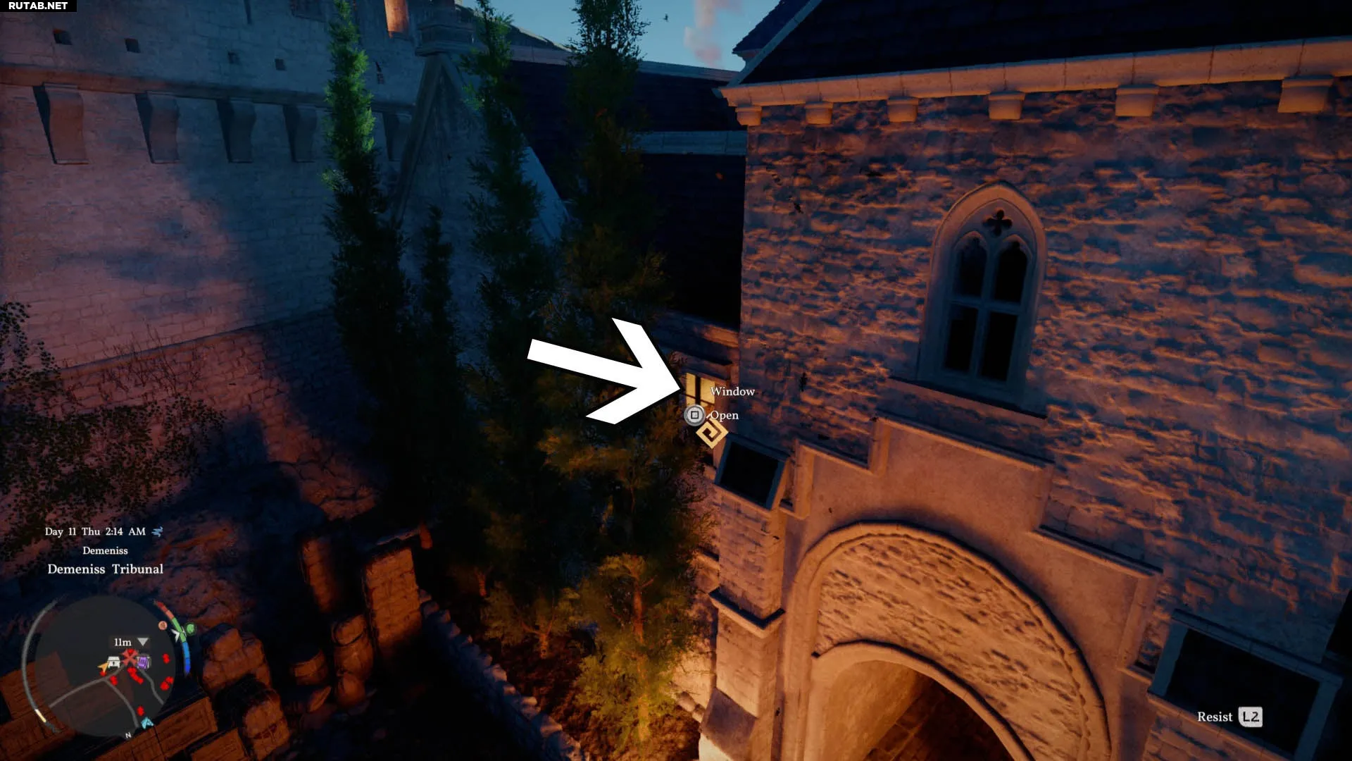 Оказавшись на крыше, спуститесь к юго-восточной башне (она рядом с арочным входом в Трибунал). Со стороны города, на первом этаже за деревом, есть окно. Откройте его и пролезьте внутрь — вы окажетесь прямо перед сундуком.