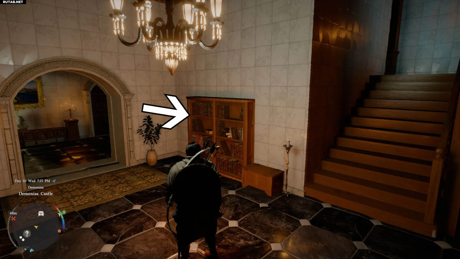 Внизу лестницы посмотрите направо — там будет книжный шкаф. Взаимодействуйте с ним, чтобы пройти в секретную комнату. Сундук окажется прямо перед вами.