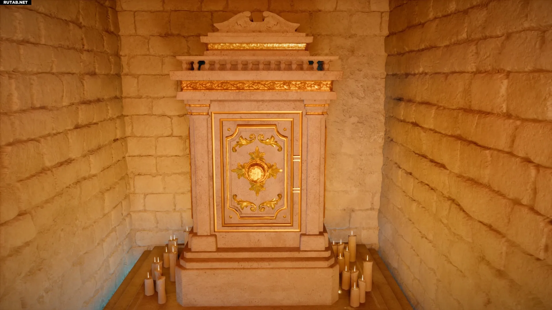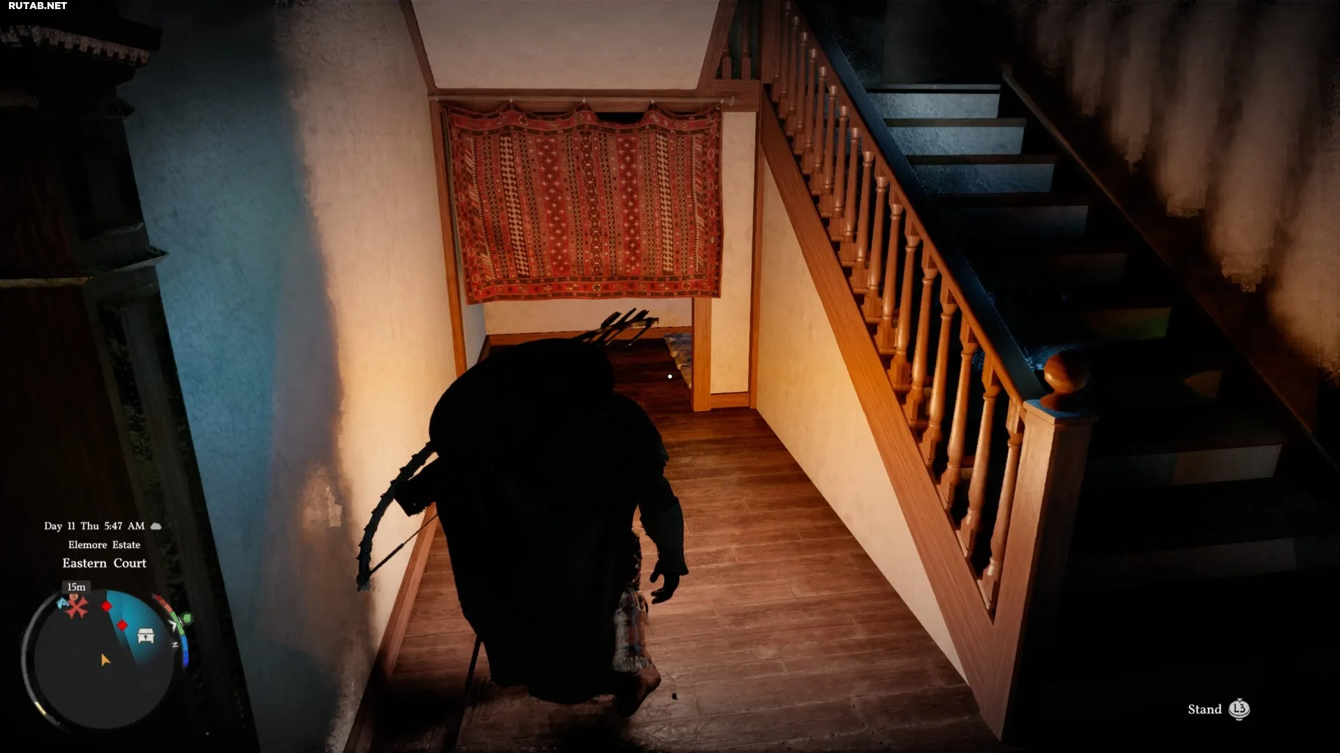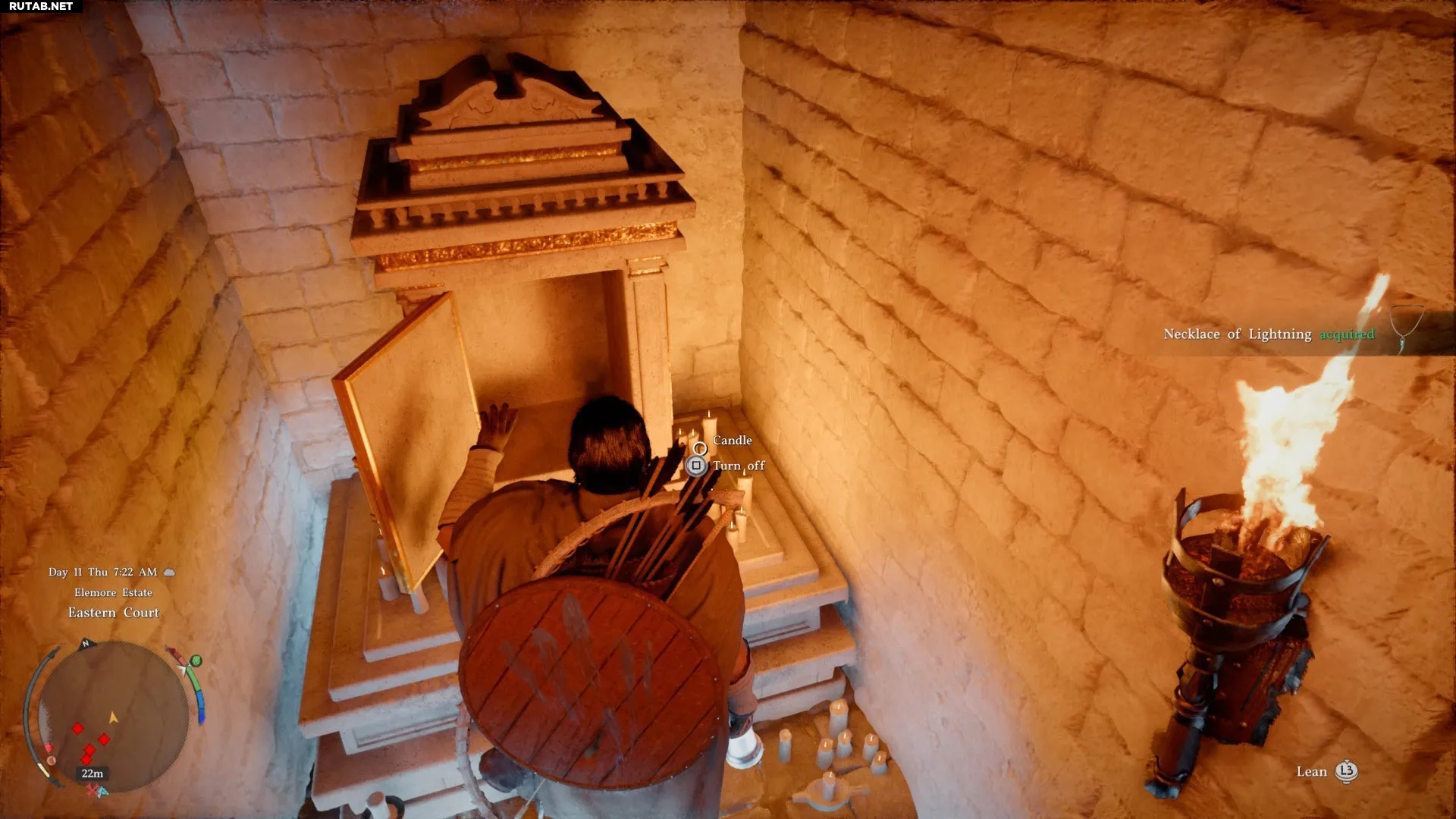 Внизу лестницы найдите висящую ткань. Пройдите за неё и спуститесь в отверстие справа. В секретной комнате прямо перед вами и будет находиться нужный сундук.
