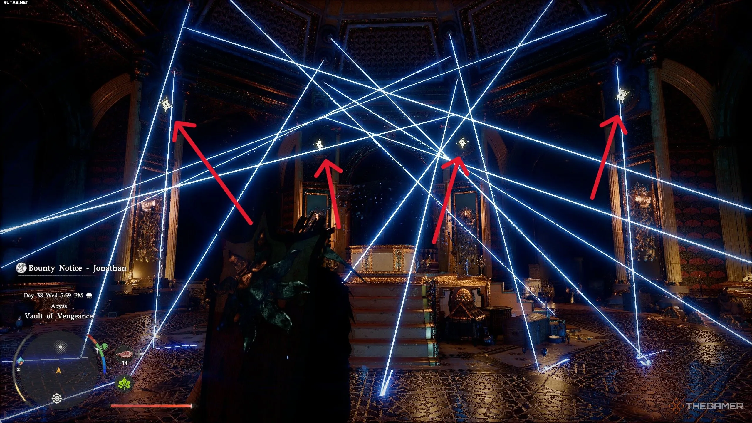 Внутри вас встретит множество лазерных лучей, которые наносят урон при соприкосновении. Аналогично тому, как вы открывали дверь, найдите четыре жёлтых переключателя в левом и правом задних углах комнаты. Снова используйте навык «Прицельный выстрел», чтобы одновременно отметить и поразить все четыре цели. Бывает сложно понять, отмечены ли они, поэтому может потребоваться несколько попыток, чтобы точно попасть в каждый и деактивировать лазерную сеть.