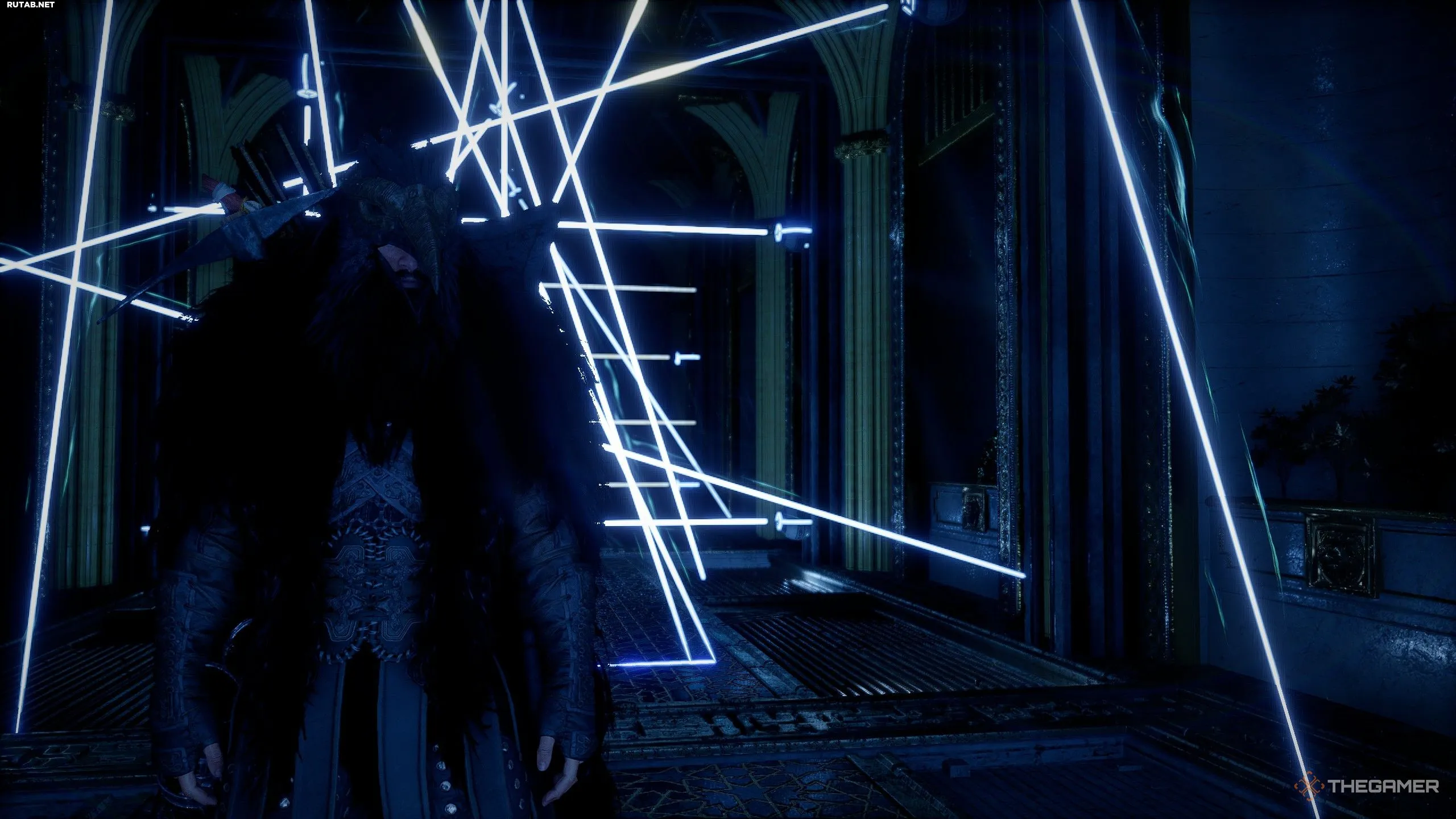 Теперь спуститесь на нижний этаж, пока не окажетесь в коридоре с множеством лазерных лучей, образующих различные узоры. Есть два способа решить эту задачу. Первый — медленно и методично проходить через движущиеся лазерные узоры. В каждом из них будут появляться различные проёмы, через которые можно пройти, пригнувшись, чтобы избежать попадания.