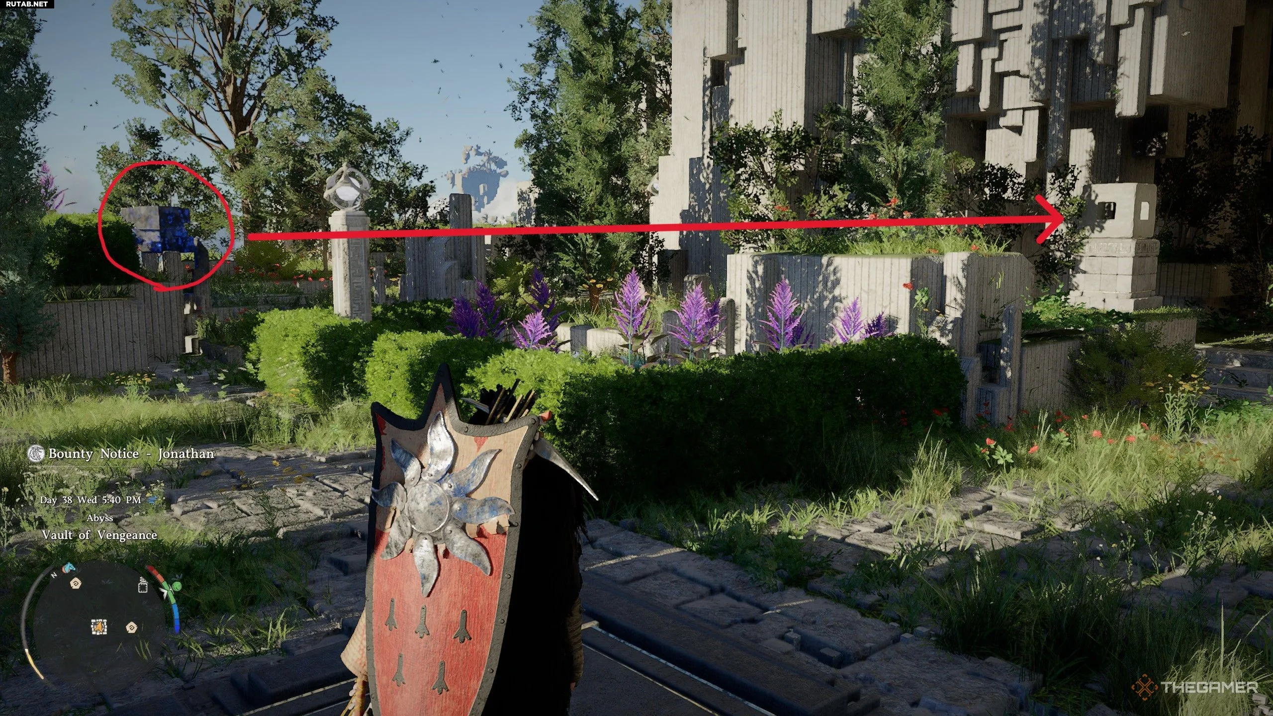 Добравшись до острова, вам сначала нужно получить доступ к самому хранилищу. Для этого посмотрите налево и возьмите квадратное Ядро Бездны, парящее возле кустов. Перенесите его на квадратный пьедестал прямо перед главными воротами и оставьте там. Затем возьмите Ядро Бездны справа и повторите те же действия с пьедесталом справа.