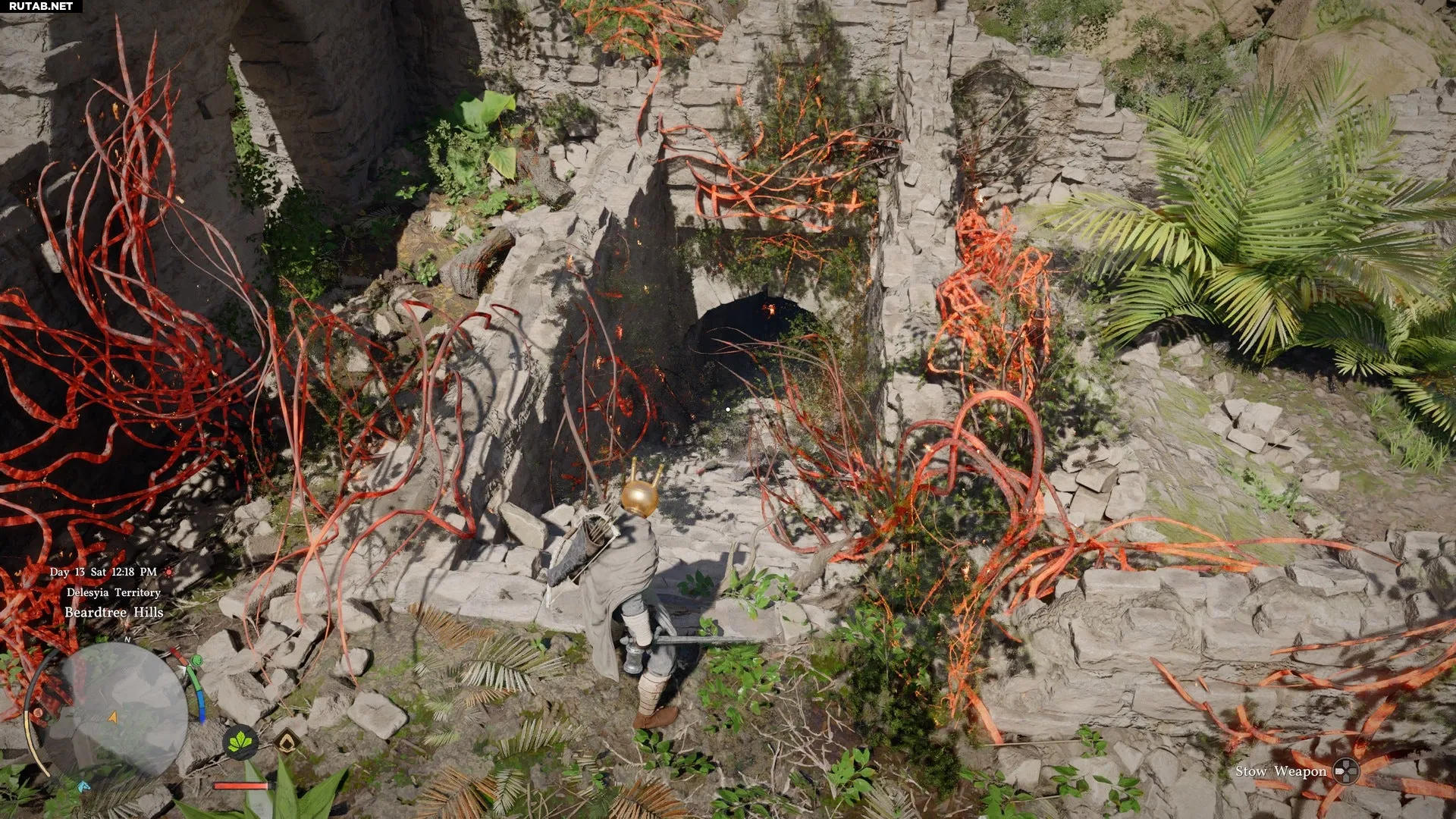 Подойдя к руинам, вы увидите, что спуск в подземелье преграждают ядовитые заросли. Чтобы очистить путь, нажмите L1 + R1, а затем используйте навык «Ослепляющий свет» (Blinding Light), активируемый кнопкой L1, чтобы поджечь их.