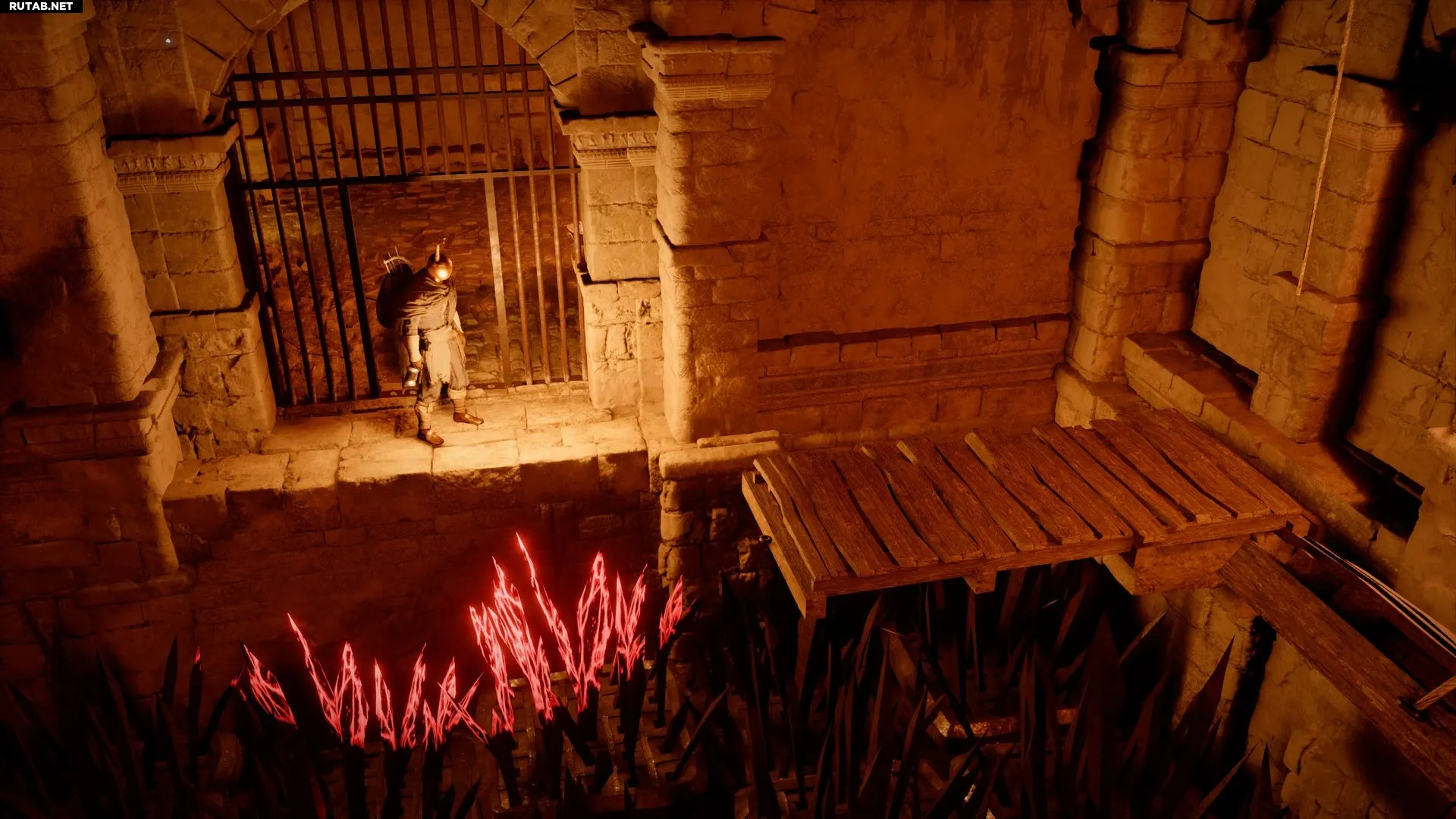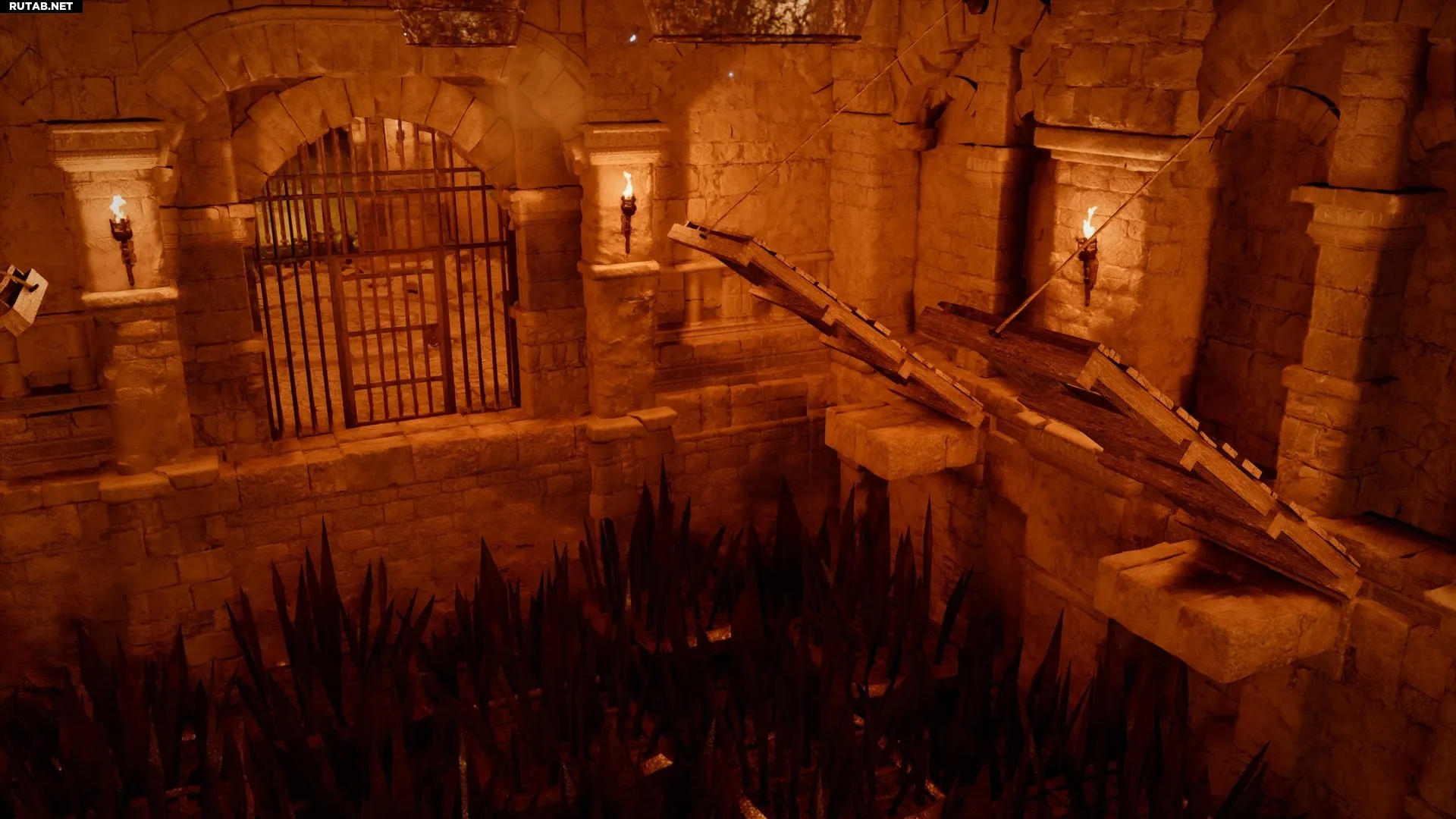 Внутри вас ждёт комната с ловушкой-шипами на полу. Через яму перекинуты мостки, подвешенные на верёвках. Ваша первая задача — преодолеть эту ловушку.