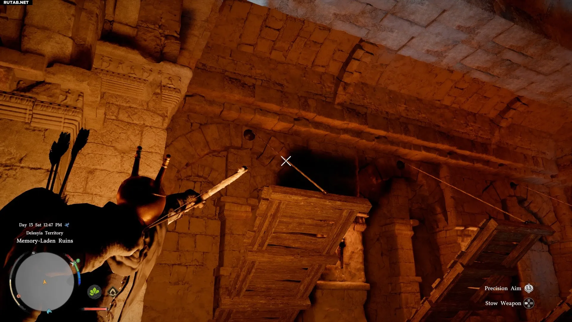 Если вы не хотите заниматься поисками, готовое решение ждёт вас ниже. А пока нужно перебраться через шипы. Для этого прицельтесь из лука (D-pad) и перестреляйте верёвки, удерживающие мостки. Они упадут, и вы сможете перепрыгнуть по ним. В качестве альтернативы можно карабкаться по стенам и спрыгивать на доски.
