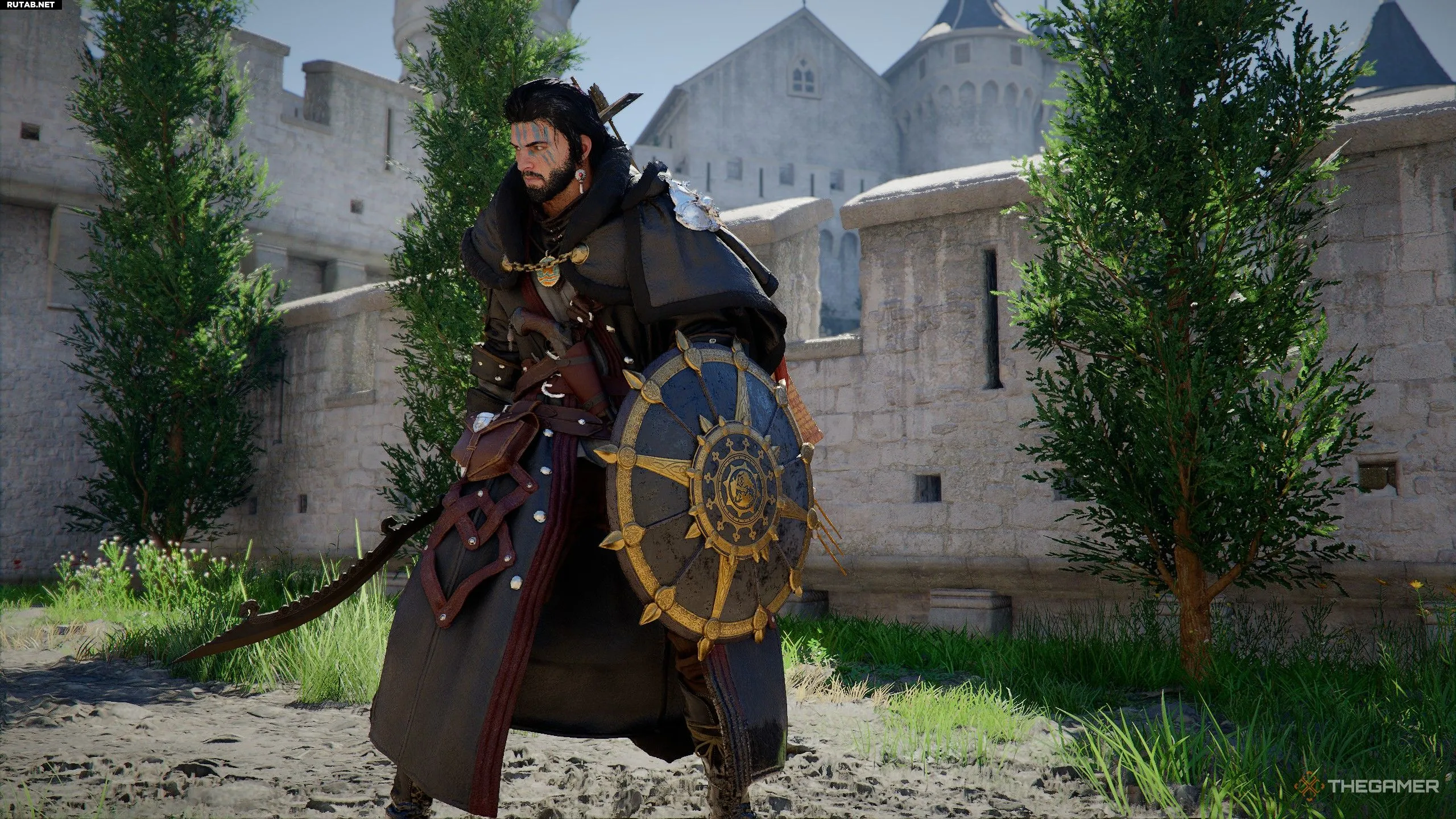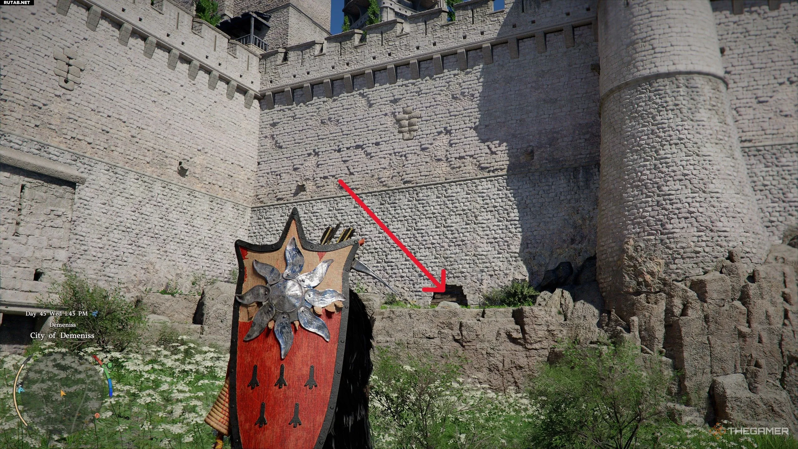 Чтобы найти щит, отправляйтесь к замку в южной части города и найдите длинный мост, ведущий с улиц к главному замку. Спрыгните в воду и проплывите под самой дальней от замка аркой (показана на изображении выше). Повернитесь лицом к замку и вонзите нож в стену, нажав левый триггер.