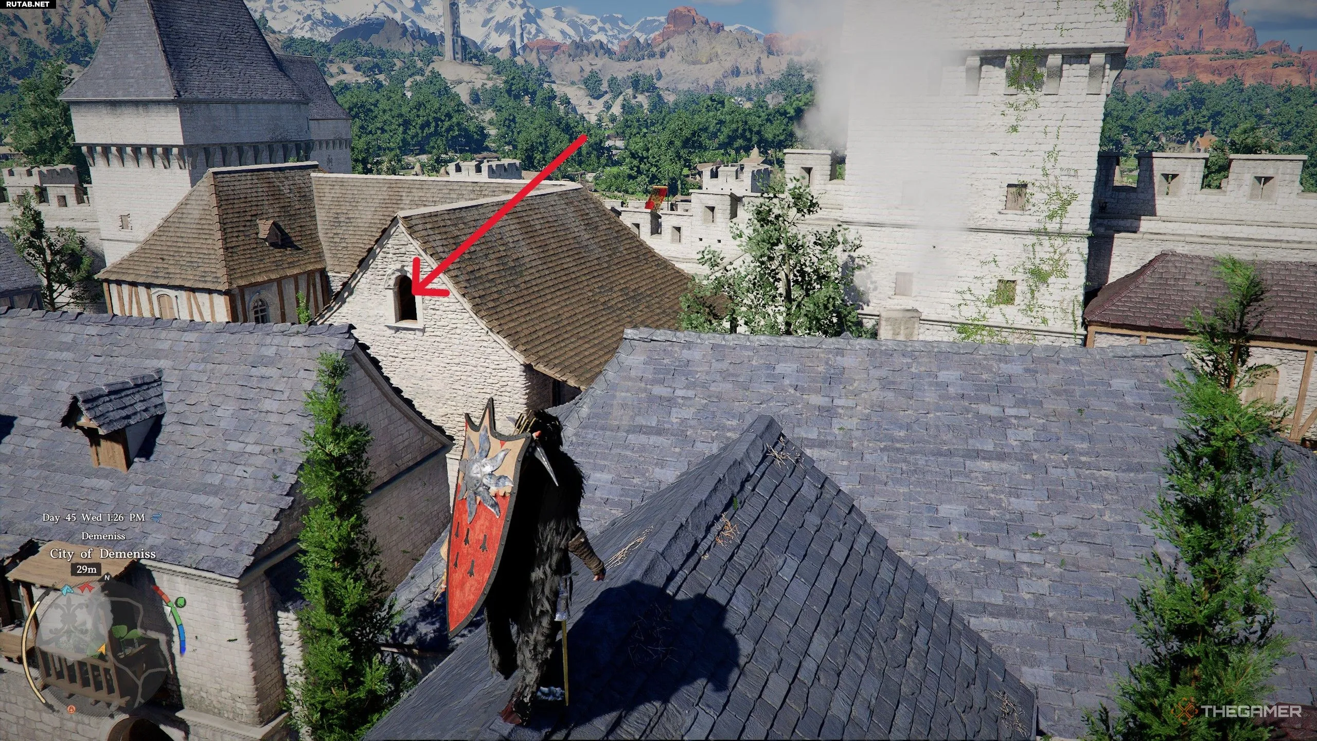 К счастью, чтобы найти плащ, далеко ходить не нужно. Вернитесь наружу к башне, где вы нашли перчатки, и посмотрите на ту сторону, где вы использовали Силовой толчок, чтобы попасть в потайную комнату. Слева от неё будет П-образное здание с коричневой крышей. Найдите на втором этаже окно, которое можно открыть, оно расположено прямо над каменной аркой.