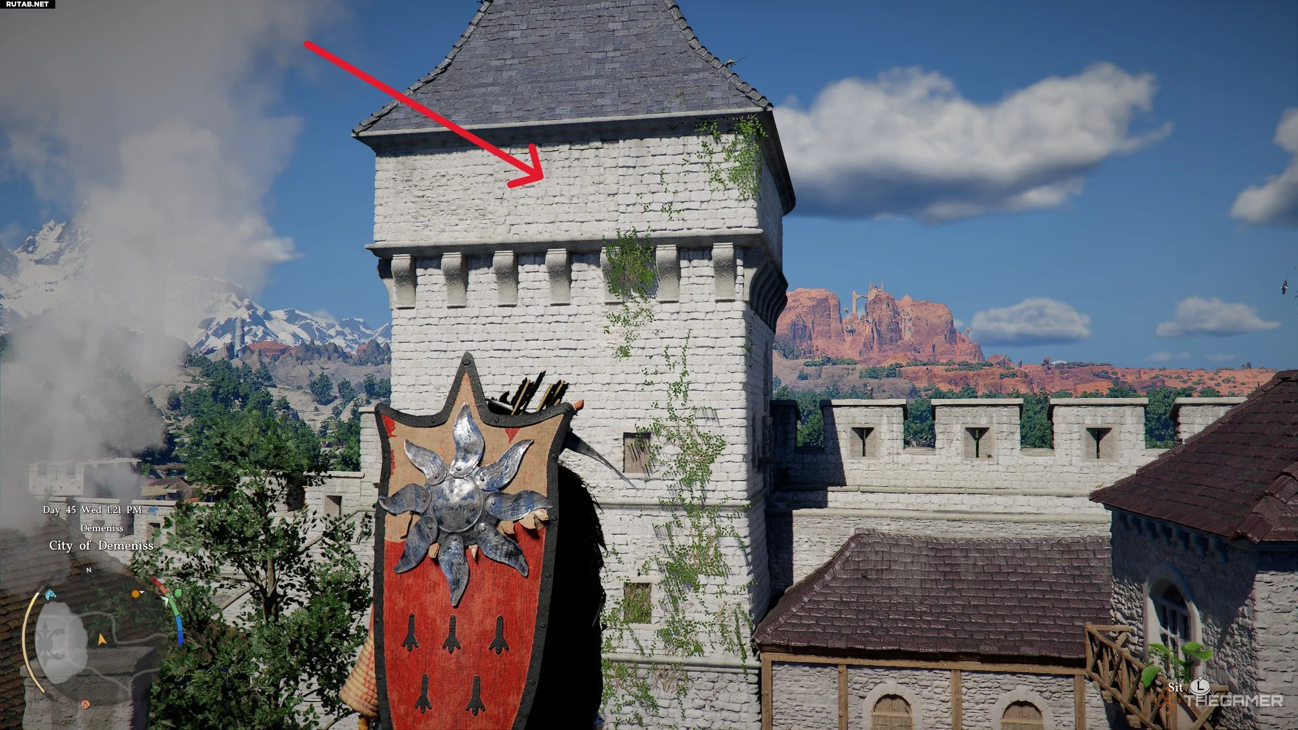 Теперь направляйтесь на север, к внутренней стене, и ищите сторожевую башню, по одной из сторон которой вьётся много лоз. Подойдите к башне и поднимитесь по её южной стороне, где растут все эти лозы.