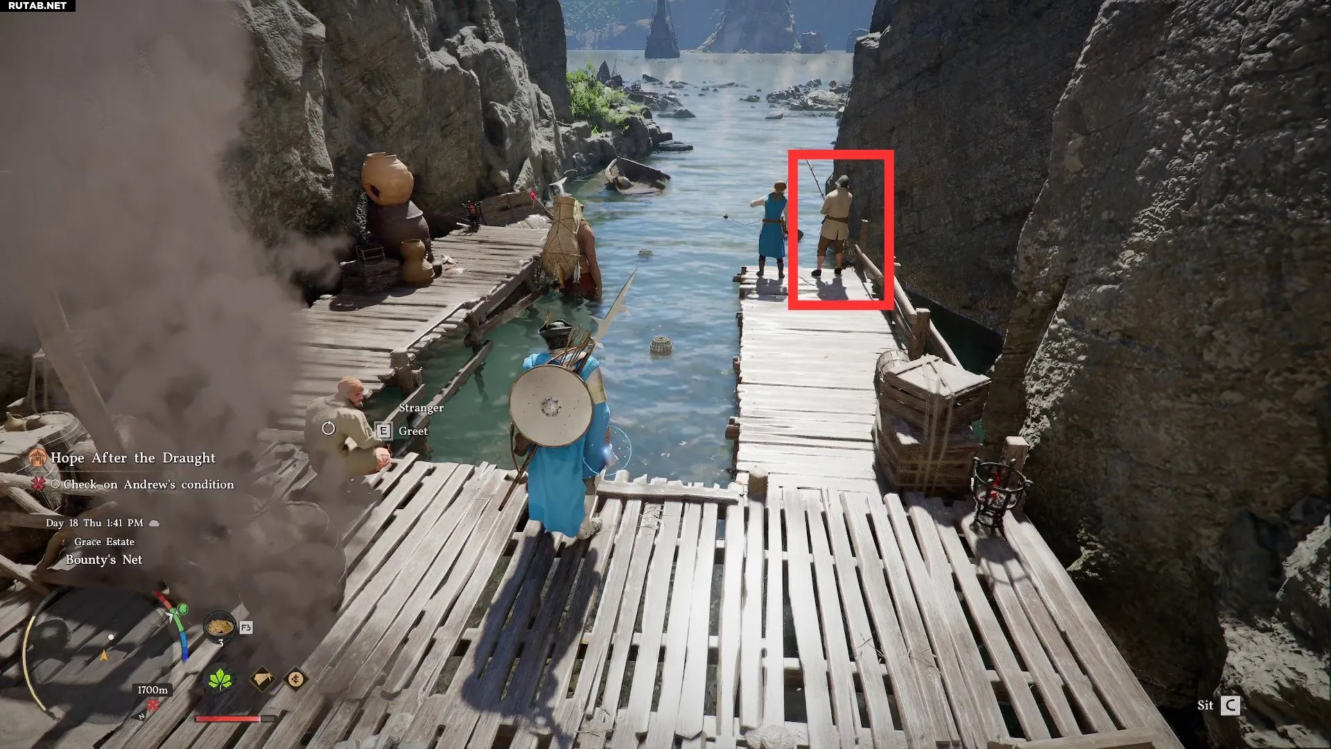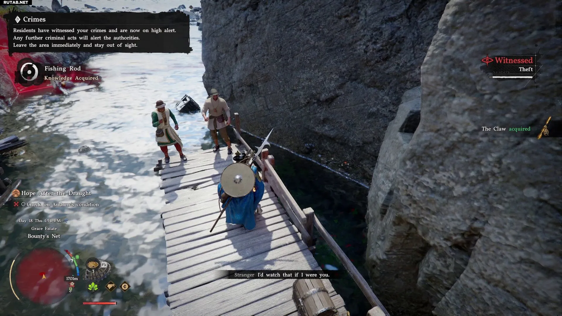 Для начала вам понадобится маска, которую необходимо надеть, чтобы получить возможность воровать. Затем отправляйтесь в локацию «Сеть Баунти» — это небольшой скрытый пирс, где рыбачат несколько персонажей. Обратите внимание на рыбака справа: он использует удочку, которая выглядит иначе, чем у остальных. Это и есть «Коготь».