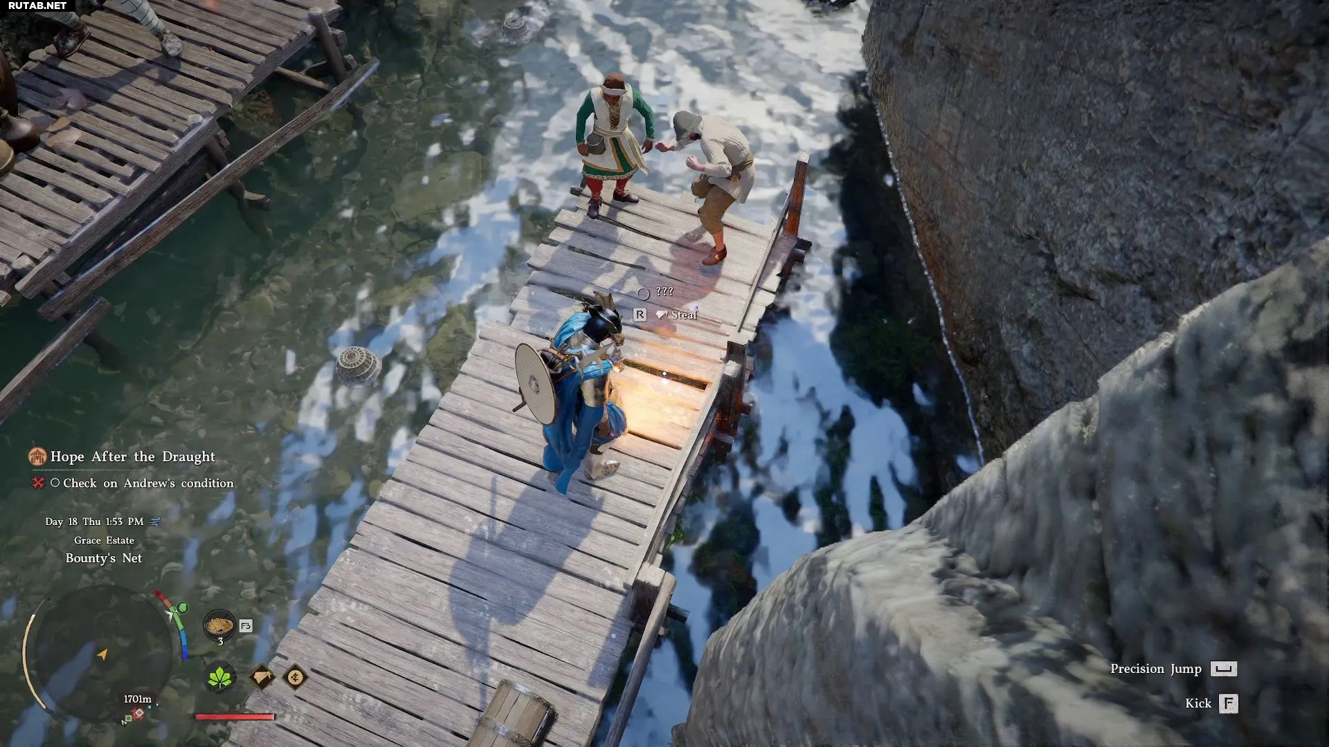 - Украсть удочку у рыбака, стоящего на краю пирса в локации «Сеть Баунти», к юго-западу от «Шпиля Прозрения».