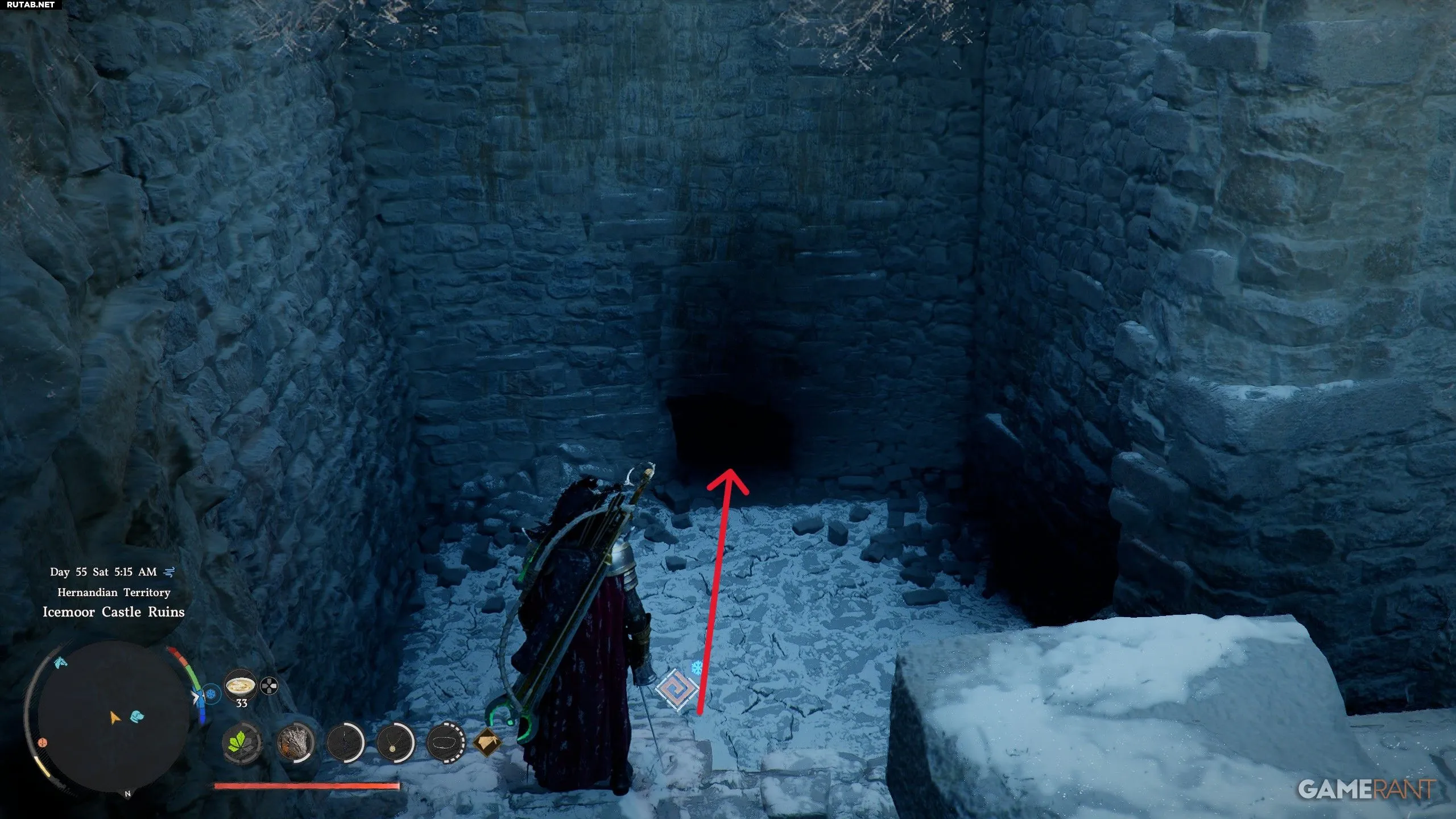 - Идите по пути до тупика, где в стене будет отверстие внизу.