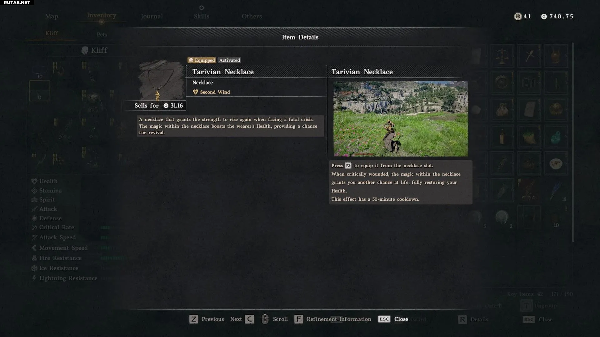 Учитывая, что игроки могут менять оружие, броню и аксессуары на лету с помощью колеса экипировки, вы можете сражаться с другим ожерельем, а когда здоровье станет низким, переключиться на Тарвианское вместо лечения. После следующего серьёзного удара сработает «Второе дыхание», восстанавливая 100% HP. Затем снова смените амулет и продолжите бой как обычно.