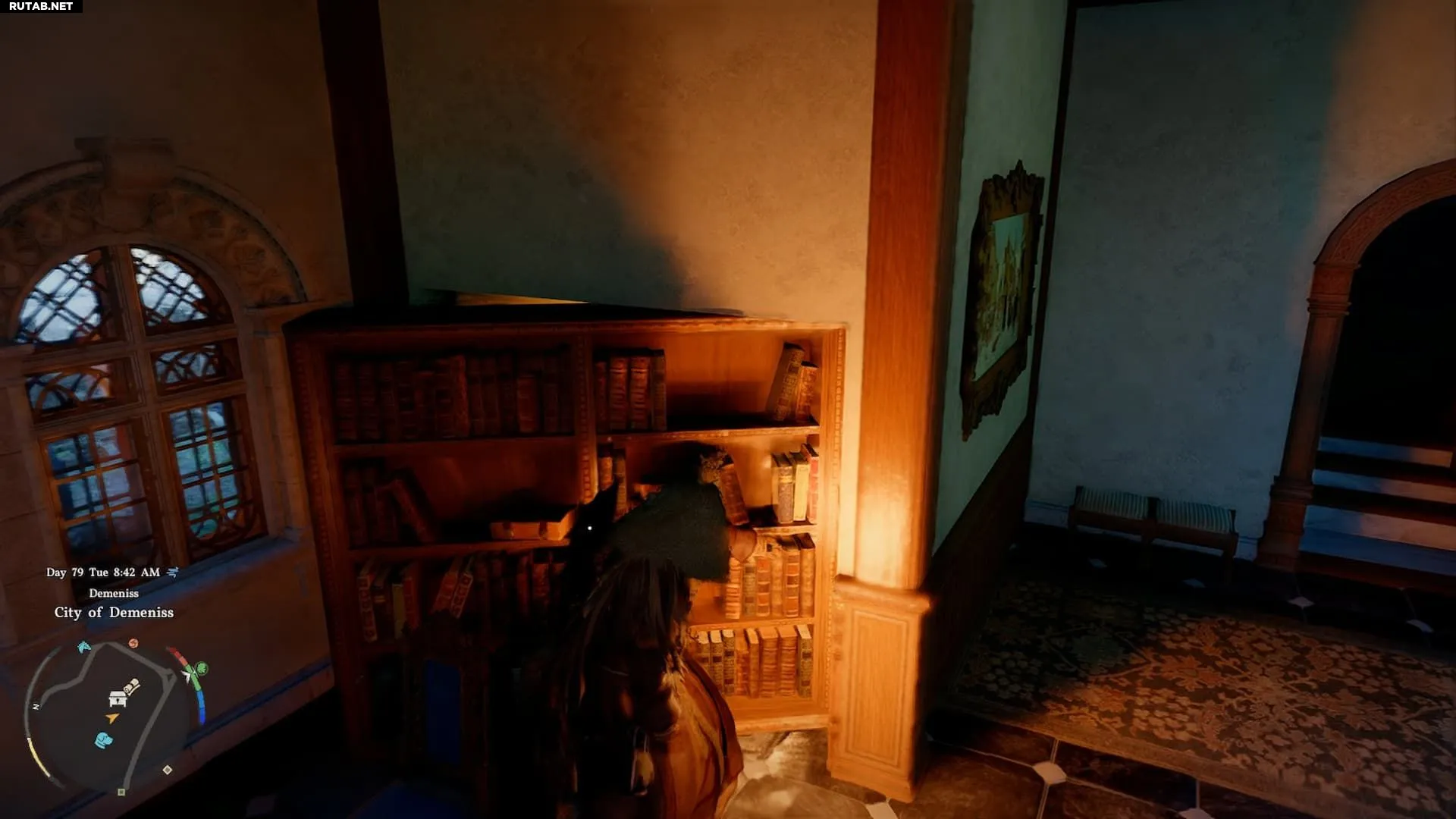 Войдите в дом знати через любой вход (возможно, понадобится ключ) и найдите книжный шкаф в углу рядом со входом на кухню. Нажмите на шкаф, чтобы открыть потайную комнату со сейфом внутри.