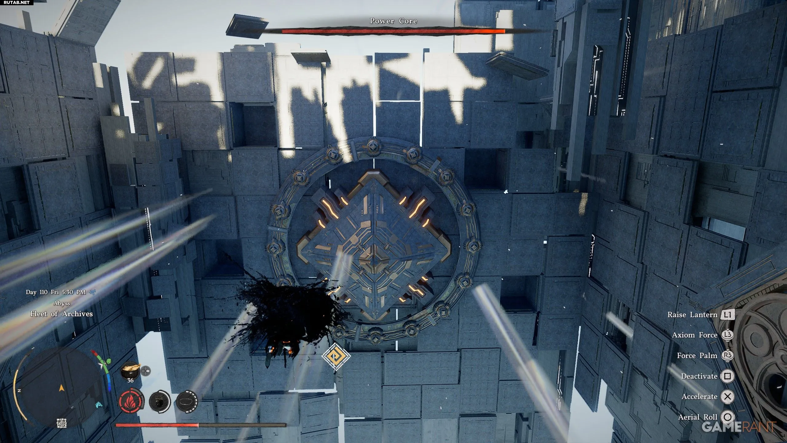 - Используйте кнопку полёта, чтобы приблизиться к Энергетическому ядру; восходящие потоки снизу будут поддерживать вас и восстанавливать выносливость.
