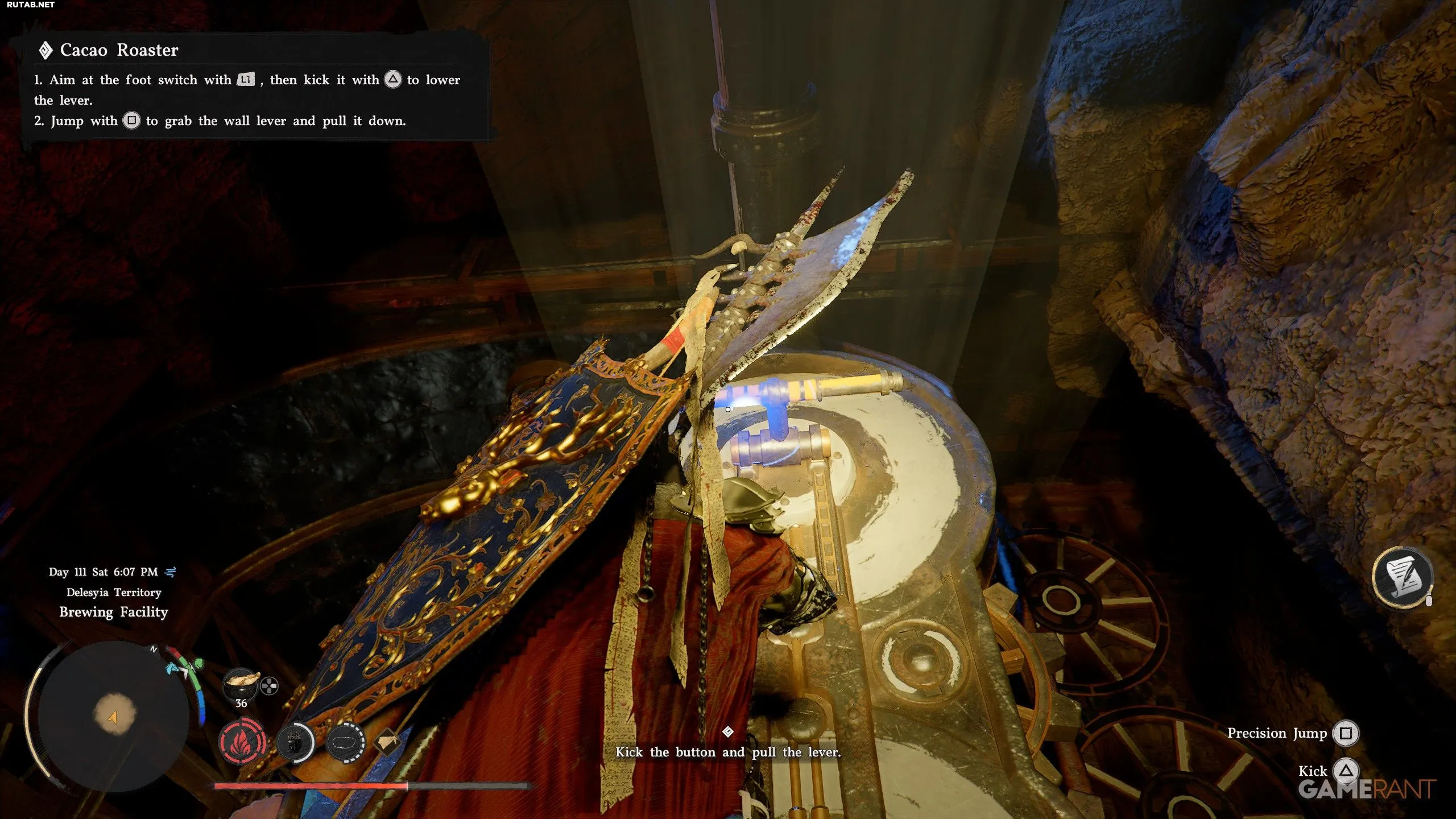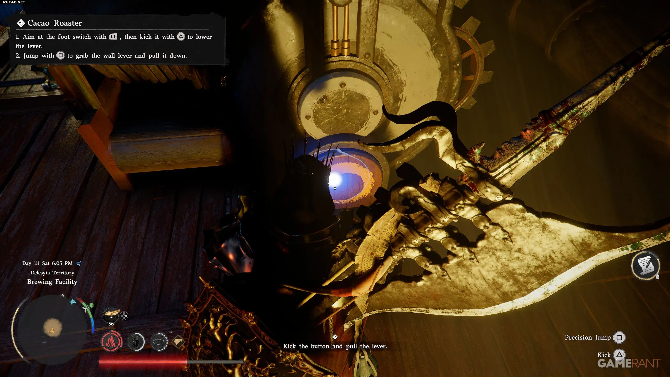 - После того как вы пнёте деревянную панель, подпрыгните и схватитесь за рычаг прямо над ней, чтобы потянуть его вниз и активировать.