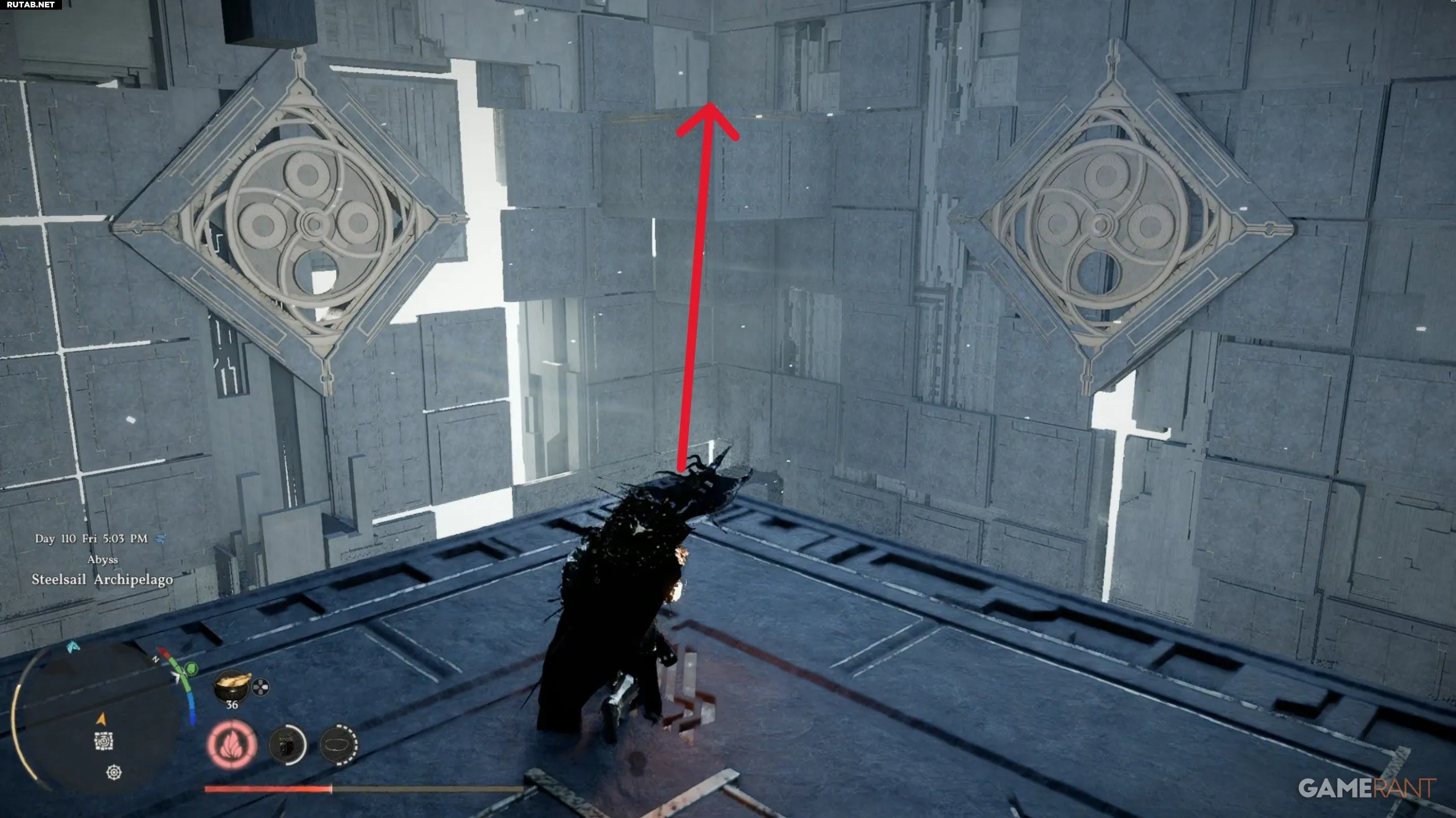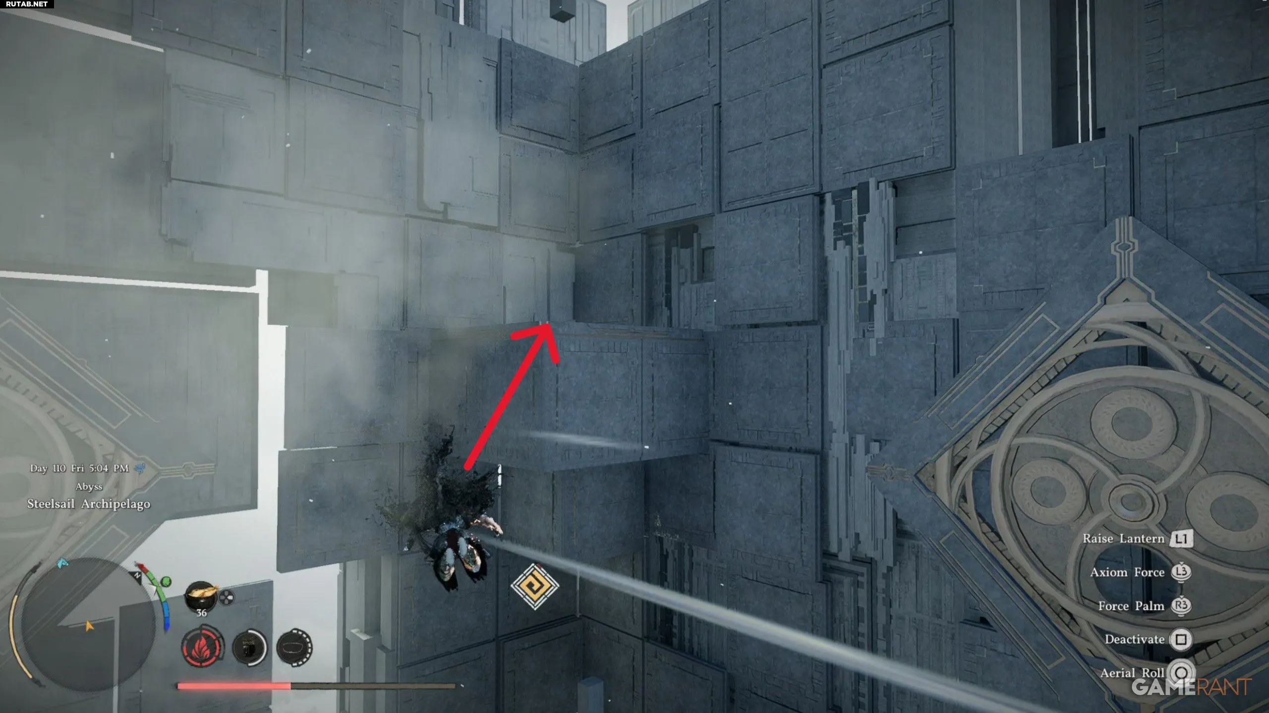 - После активации точки быстрого перемещения «Нексус Бездны», используйте прыжок, тройную «Ладонь Силы» и планирование, чтобы добраться до северо-западного угла карты.