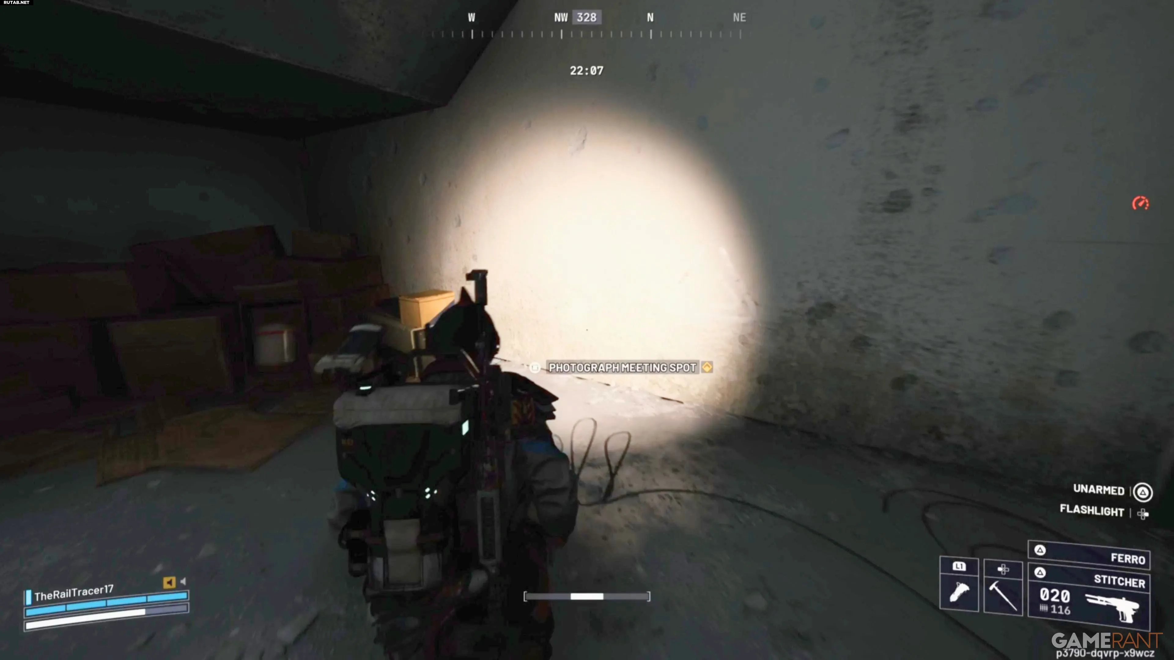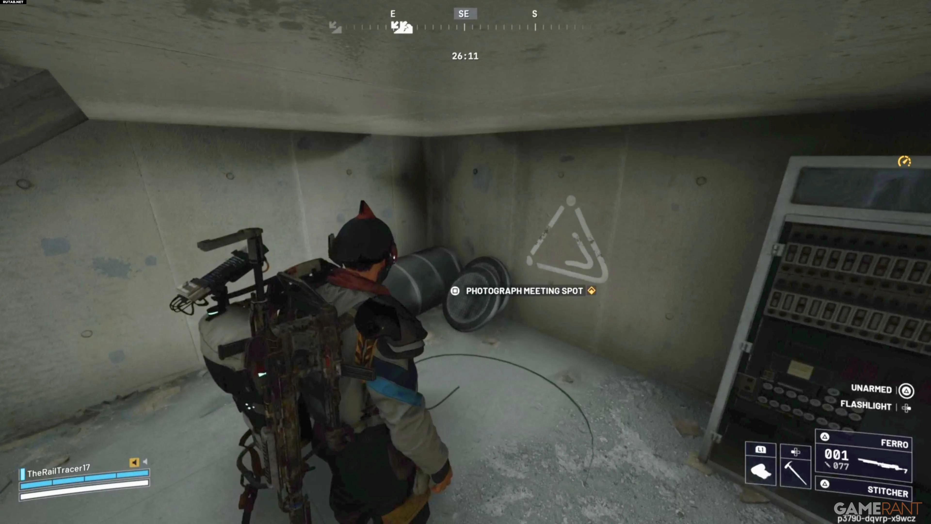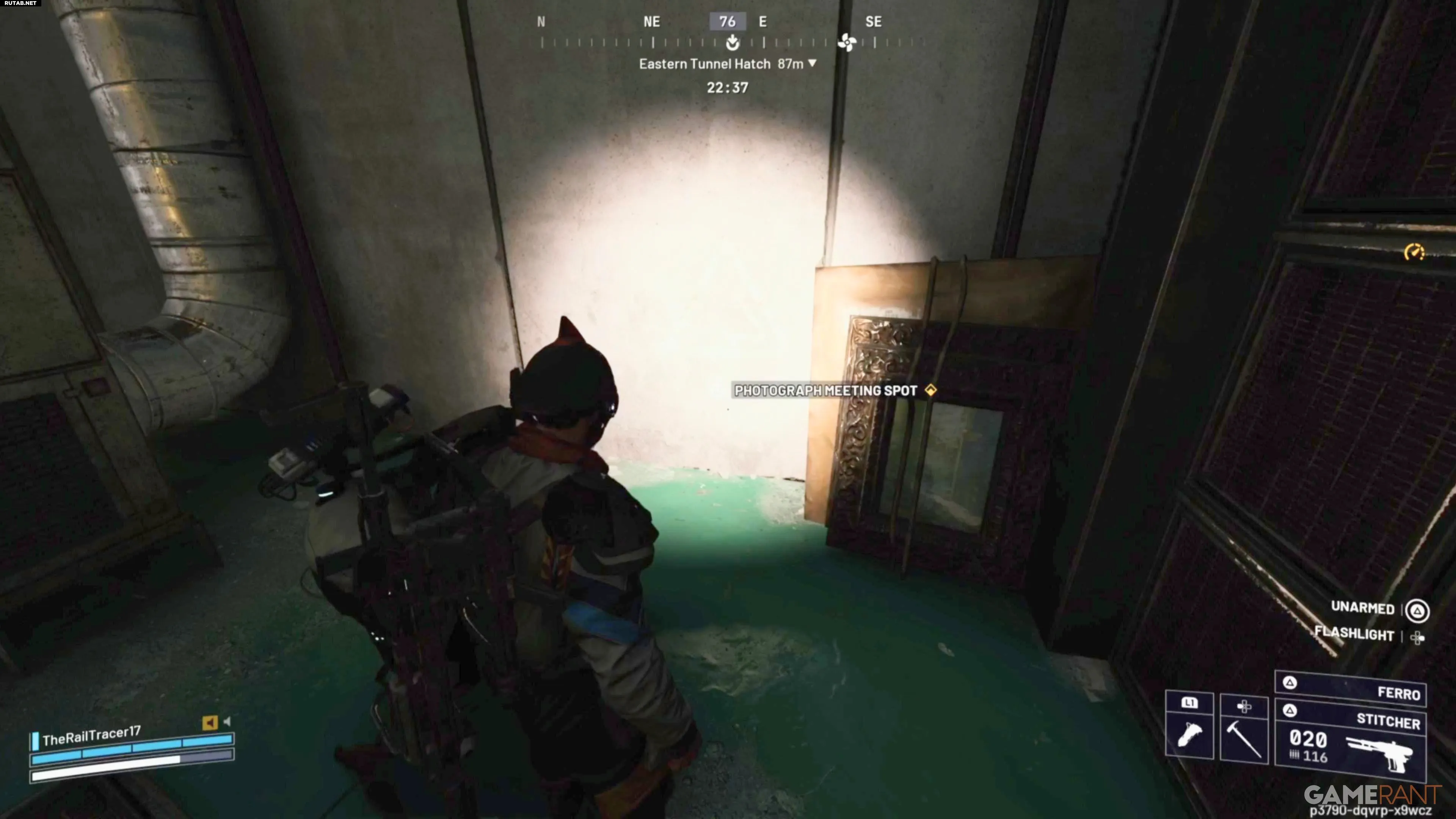 Вторая точка находится рядом с точкой эвакуации «Хранилище семян». Встав лицом к эвакуатору, идите на запад по тропе, пока не увидите дверь. Откройте её и, прежде чем идти дальше, посмотрите направо. Там вы увидите небольшое пространство. Внутри — второе место встречи. Взаимодействуйте с ним, чтобы сделать фотографию.
