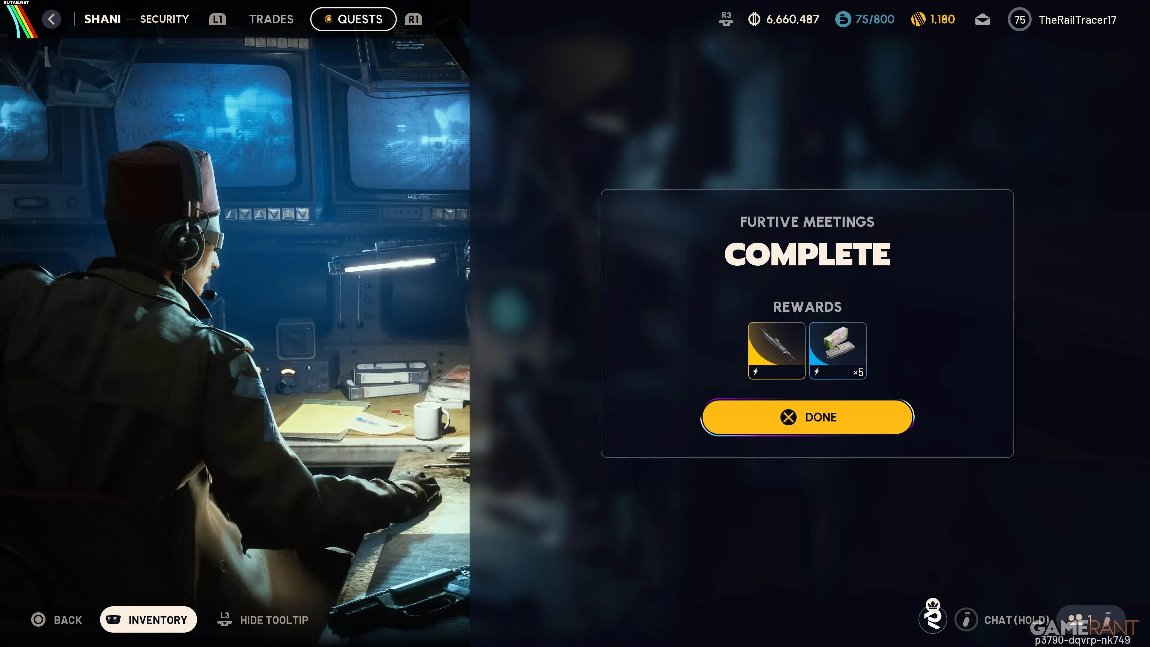 Рядом с третьей точкой находится контейнер, который можно обыскать. Внутри вы найдёте «Информацию о тайной встрече» — предмет, который нужно доставить Шани. Эвакуируйтесь на любой ближайшей станции или через люк, если у вас есть ключ. После сдачи квеста вы получите награды: