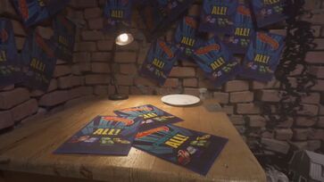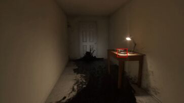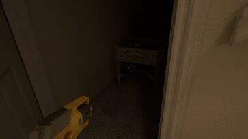 Свернув налево у «Надувного замка» на первом пути в «Игровой площадке», вы можете начать концовку ROT. Пройдите последовательность с дверями и светом, затем продолжайте движение по коридору, следуя по следам гнили на полу. Вы наткнётесь на стол в коридоре с настольной лампой рядом. Видеокассета лежит на этом столе — подберите её.