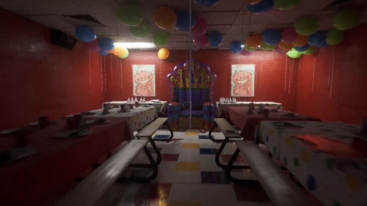 Следуйте по первому пути, пройдите погоню, ориентируйтесь по фиолетовым лампам, решите головоломку с шарами. Перед входом в «Надувной замок» сверните налево через проход за серой шторой. У двери с надписью «Выход» смотрите на телевизор, пока шкала не заполнится полностью, и пройдите через последовательность событий.