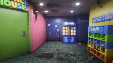 После того как вы удерживали взгляд на Смайле на «Игровой площадке» и прошли погоню, следуйте по красным стрелкам через разноцветный коридор, пока не доберётесь до аркадного зала. Подойдите к автомату рядом с табличкой «Закрыто» и подберите монету перед экраном.