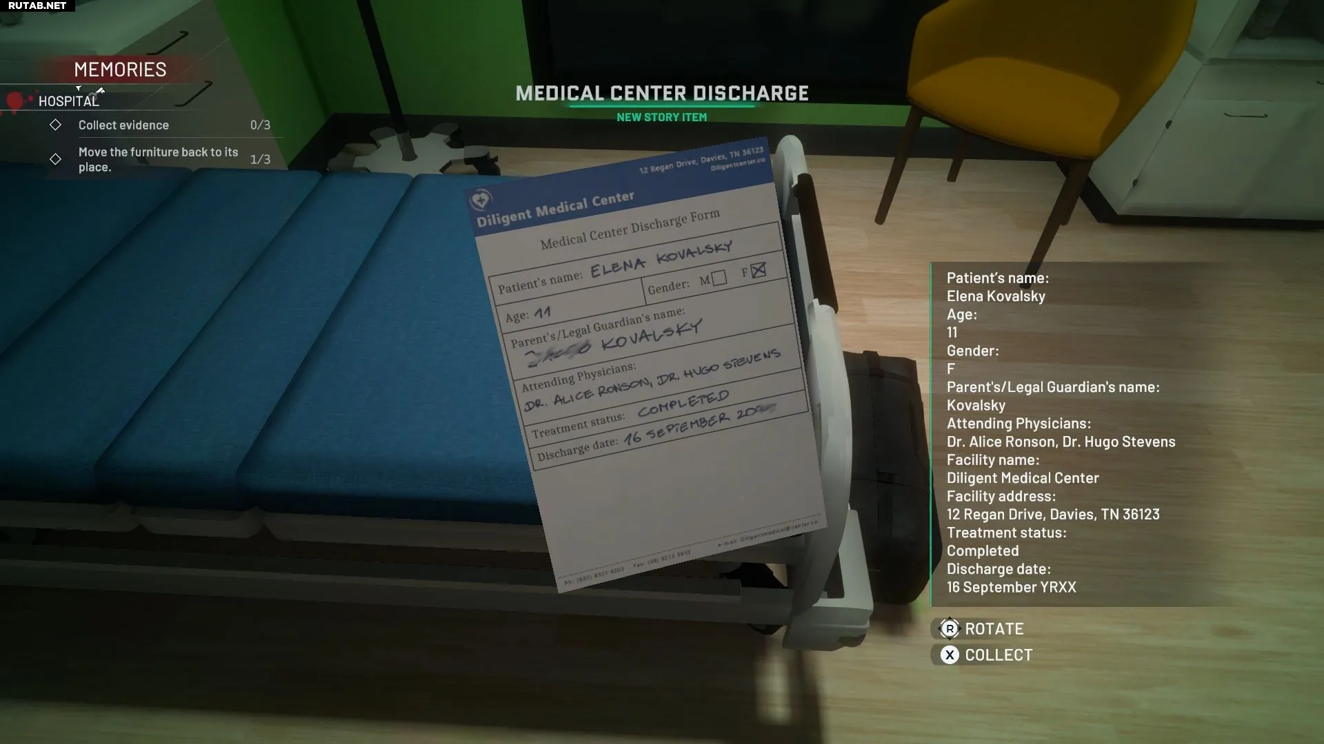 На прикроватной тумбочке лежит открытка «Выздоравливай скорее», а на синем столе — игрушечный астронавт. Необходимо взаимодействовать с этими предметами, чтобы собрать все улики.