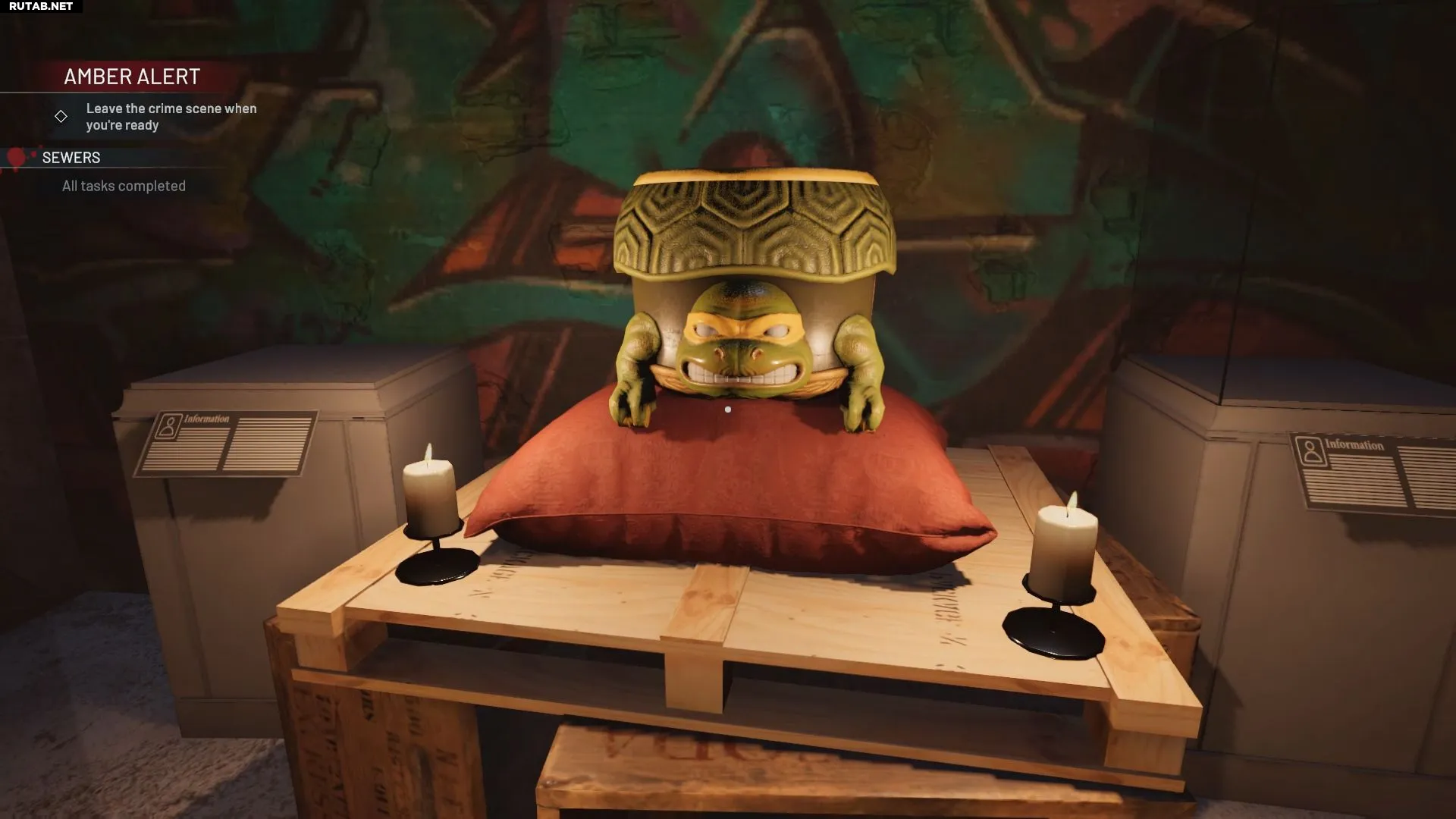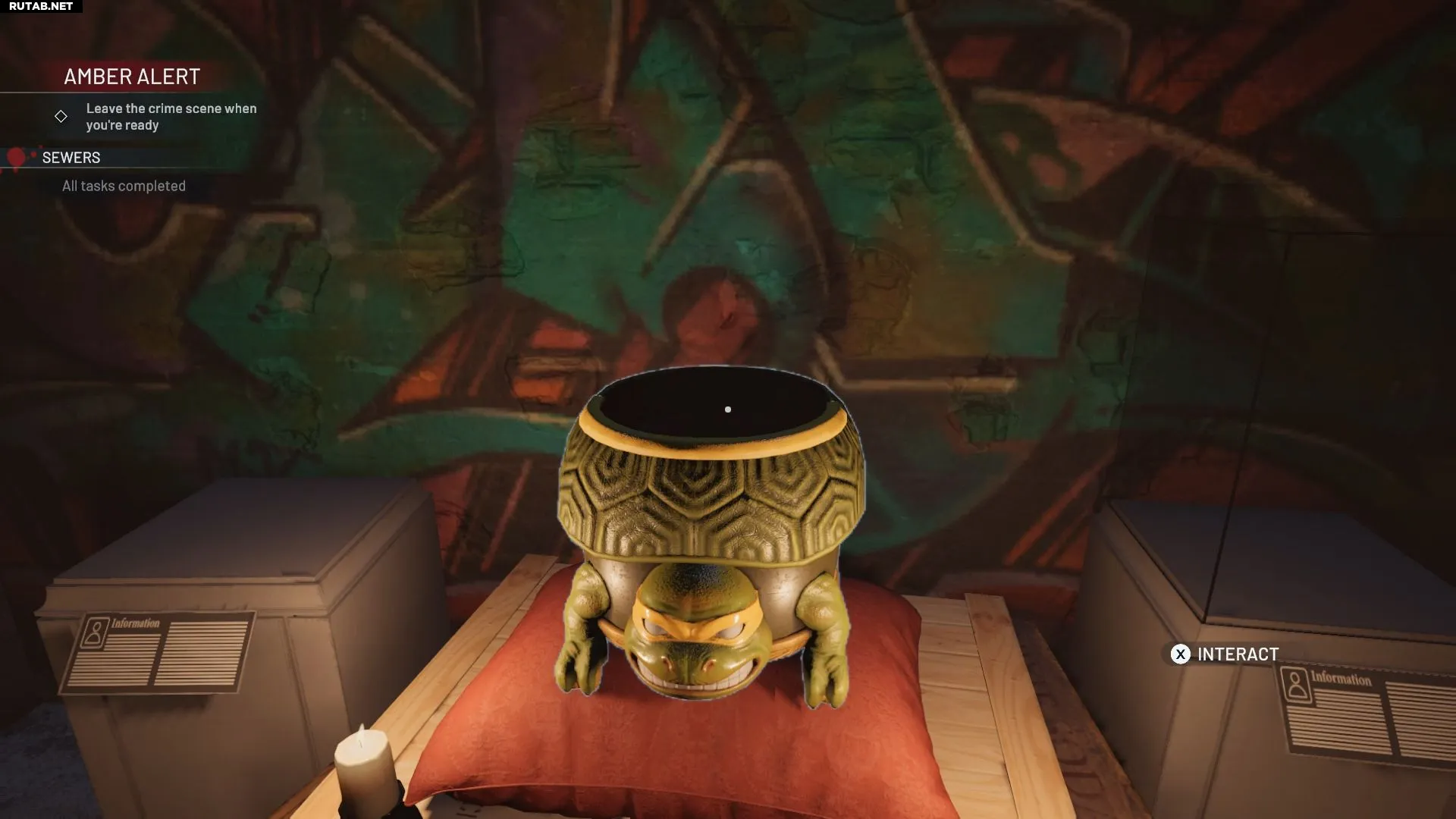 Рядом с вывеской логова находится маленький алтарь с ведром, вдохновлённым Черепашками-ниндзя.
