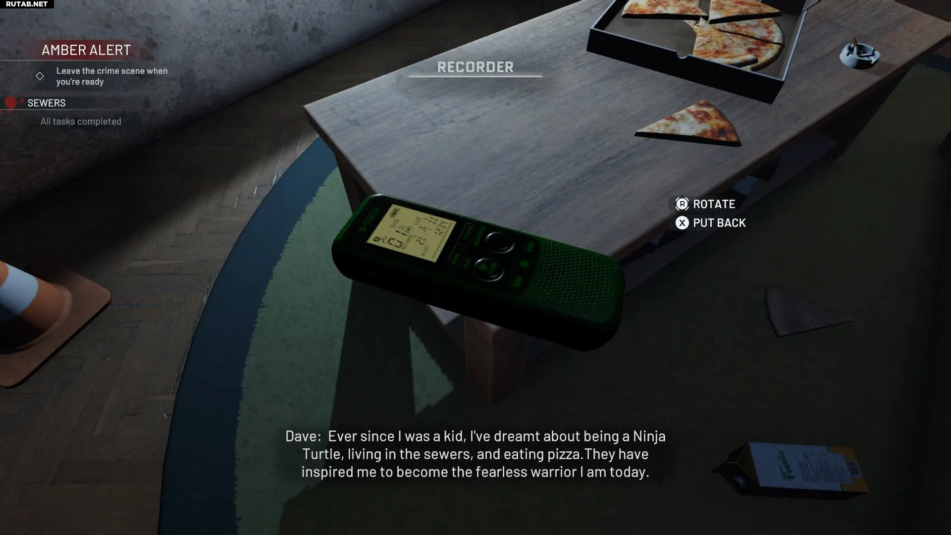Чтобы получить скин «Ведро Джона» (отсылка на Черепашек-ниндзя) во втором акте Crime Scene Cleaner, нужно найти тайное логово Дэйва. Оно скрыто за игрой в дартс на уровне «Amber Alert». Чтобы открыть проход, необходимо набрать в дартсе ровно -301 очко, стратегически бросая дротики в нужные сектора.