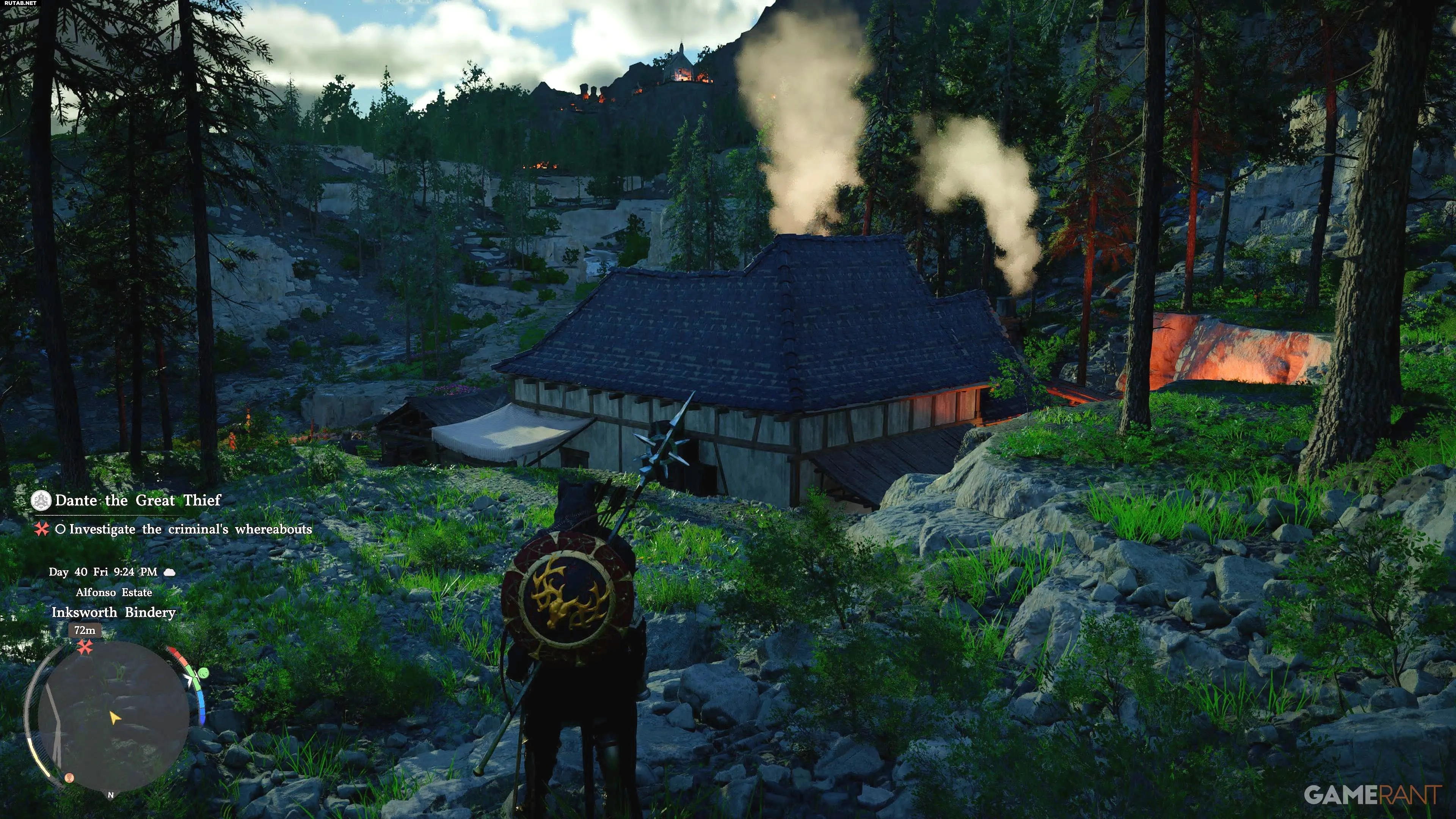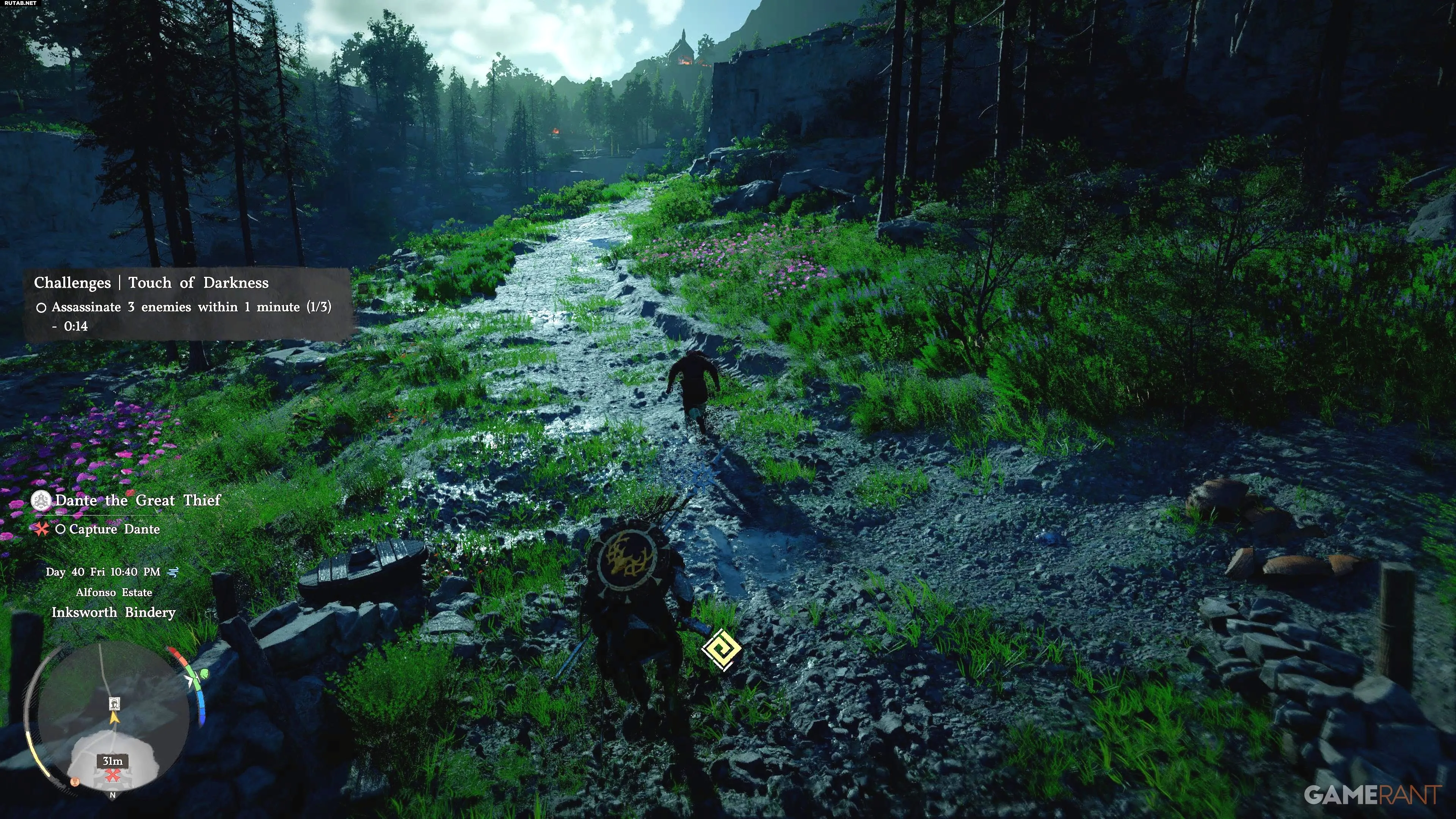 - По прибытии на место вы не сразу встретите Данте. Сначала вам предстоит освободить переплётную мастерскую Инксворт от банды разбойников «Кровоточащие». Это небольшой лагерь с обычными врагами, часть квеста дома Феликс.