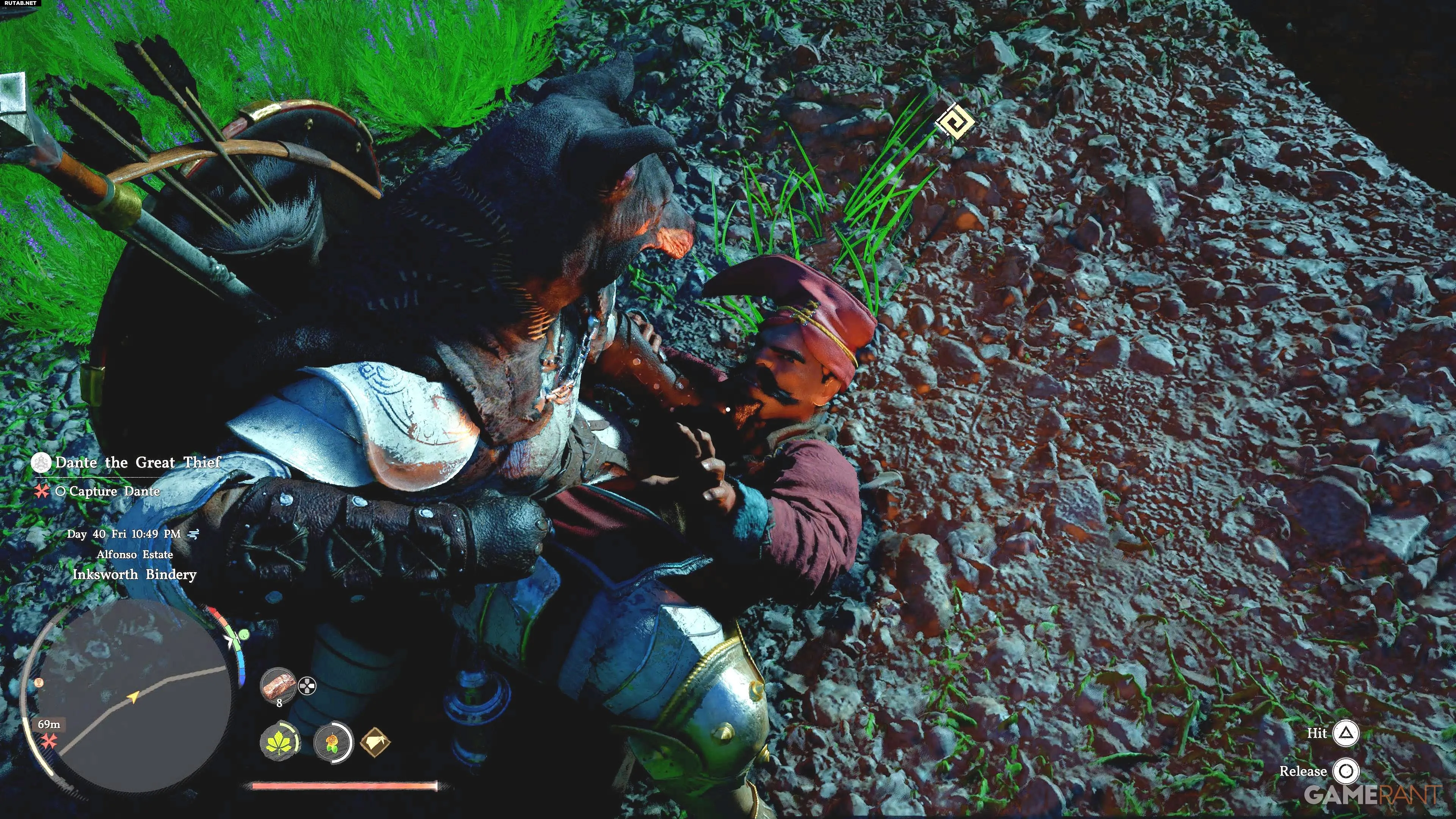 - Не теряя времени, догоните его и используйте действие «Схватить» (X/A), чтобы повалить. После нескольких ударов появится подсказка «Связать» великого вора.