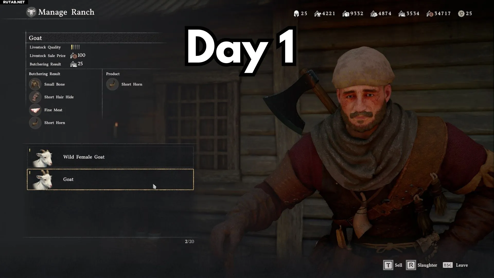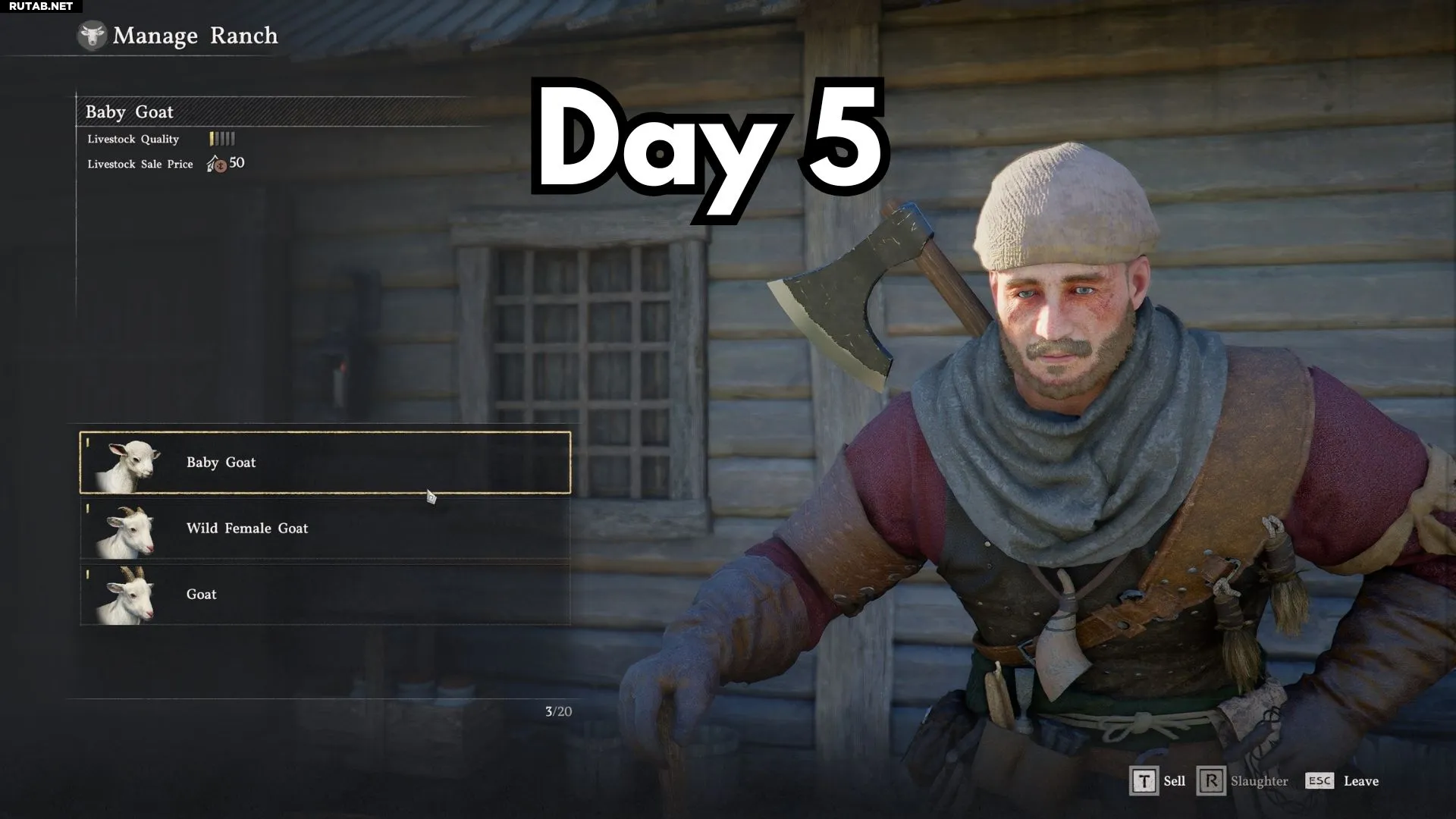Прогресс роста отображается желтыми полосками слева от имени животного в меню «Управление ранчо» у Бена. Лучший корм, который мы нашли — это яблоки, морковь, чечевица, яйца и другие овощи, которые можно купить в лавке бакалейщика в Эрнанде.
