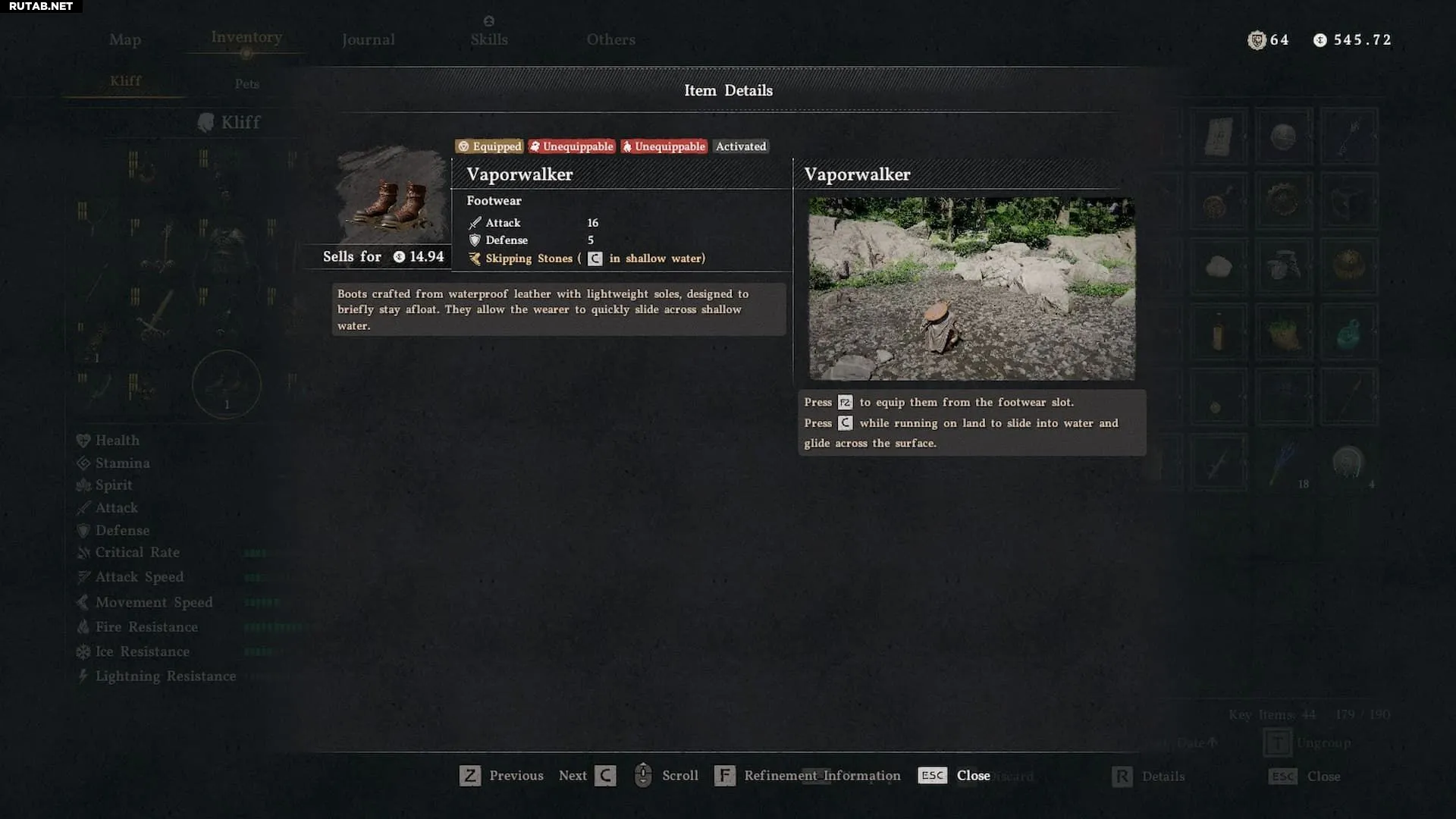 Эта особая пара ботинок позволяет скользить по мелководью. Вы всё равно утонете, если окажетесь на глубине, где придётся плыть, но интересная особенность водоходов в том, что они дают значительное ускорение, когда вы скользите по мелкой воде.