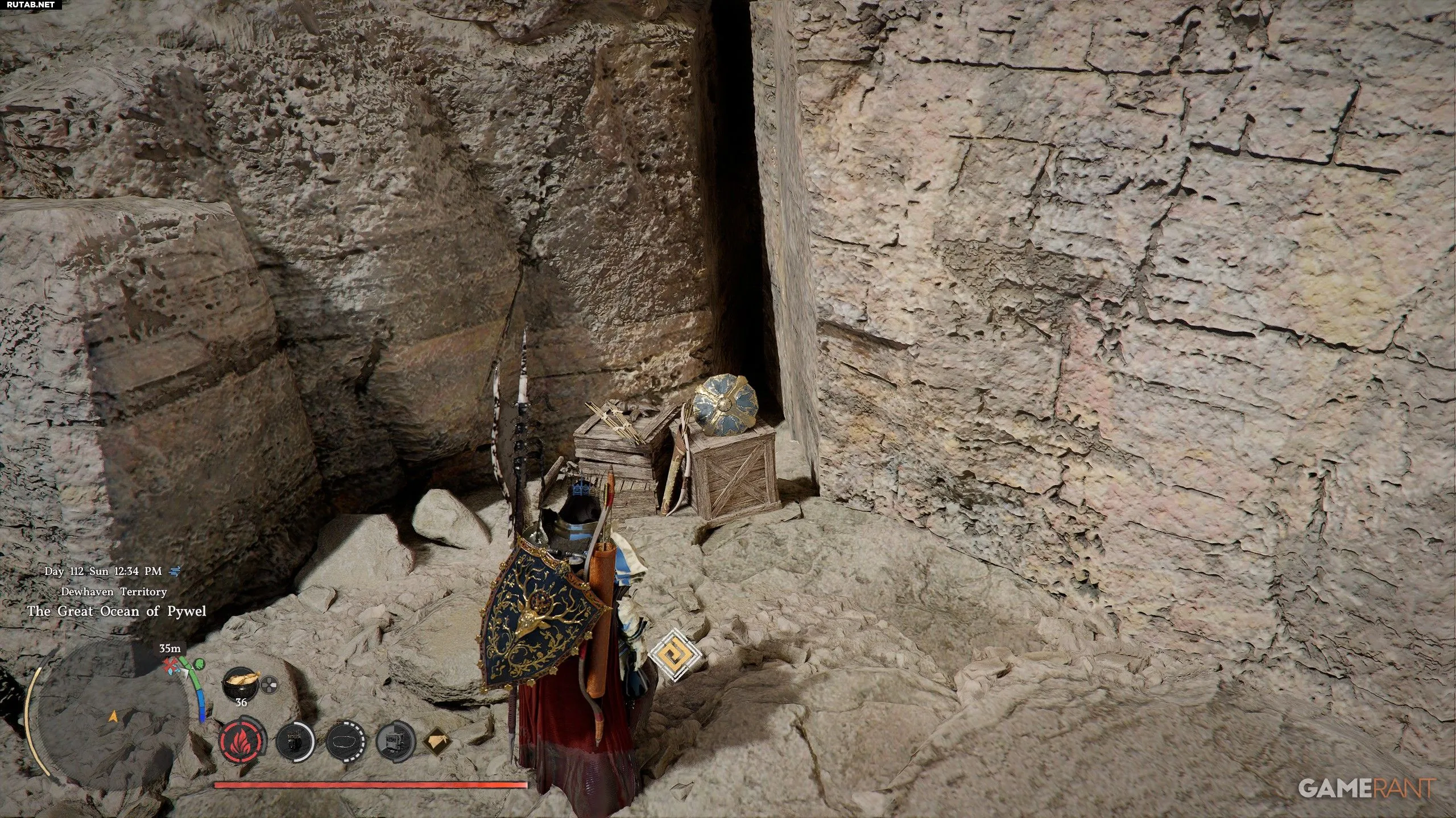- Достигнув скалистого острова, обойдите структуру сзади. Там вы обнаружите деревянный ящик, внутри которого лежат Искусно украшенный щит мастера и бесплатный Лук Белой вороны.