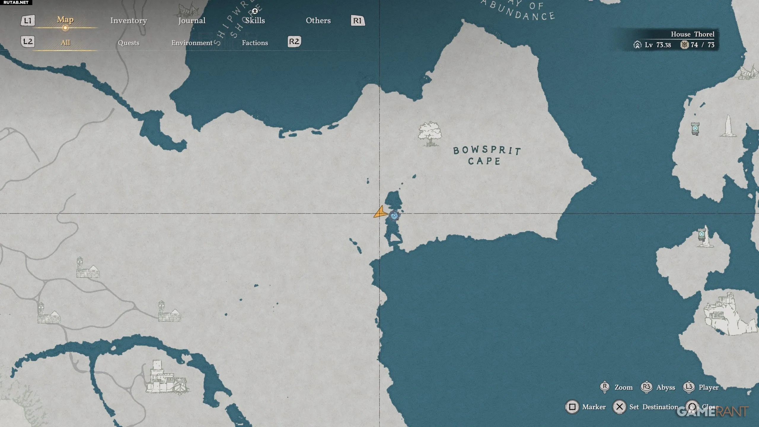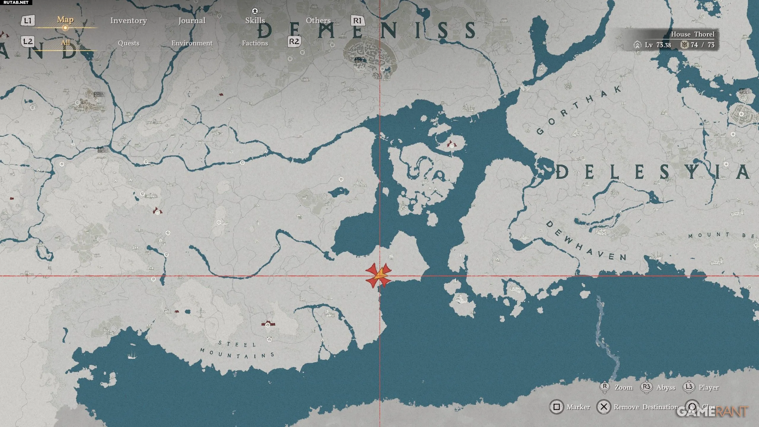 - Двигайтесь прямо на юг от буквы «N» в слове «Demeniss» на карте и к востоку от Стальных гор, чтобы найти мыс Боусприт.