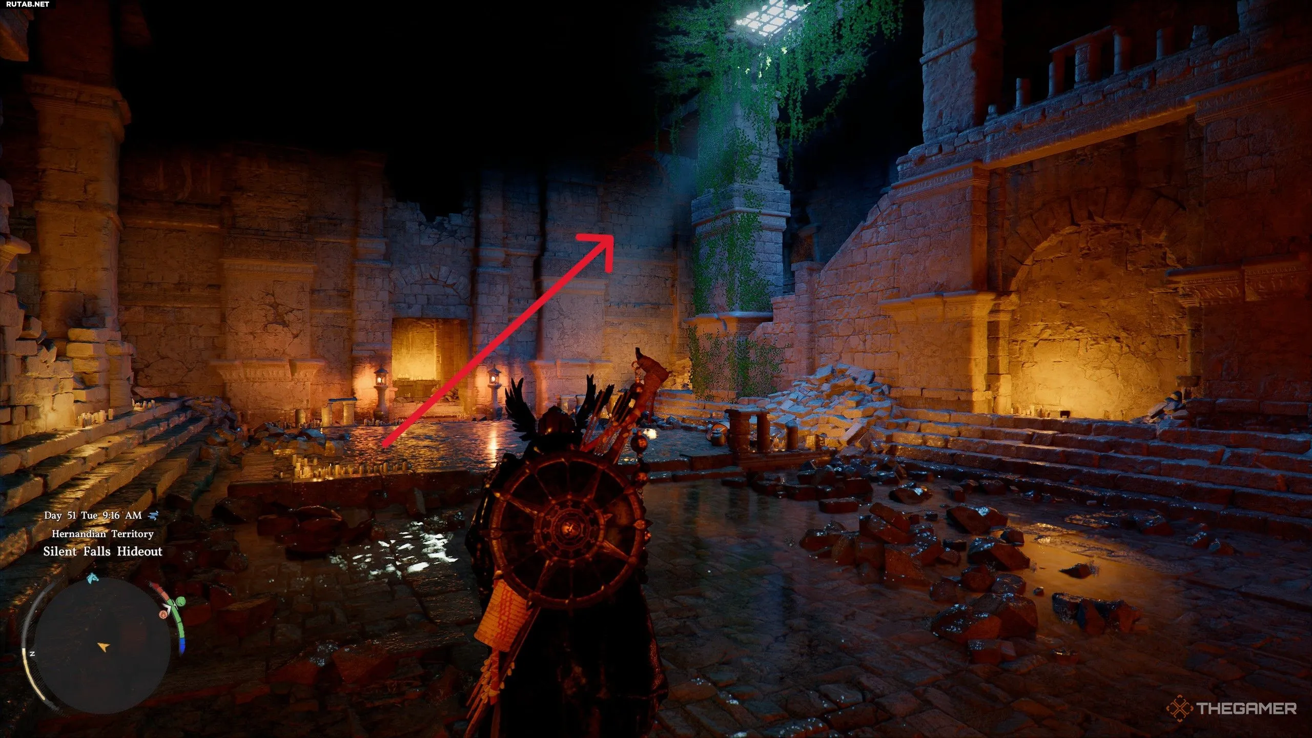 Как только Могильный скиталец будет повержен, отправляйтесь в правый верхний угол комнаты (показано выше) и нанесите удар пальмары по стене, удерживая нож в ней с помощью левого триггера. Это откроет потайную стену, перенесёт вас в секретную комнату с сундуком, в котором лежит латный плащ испепеляющего пламени.
