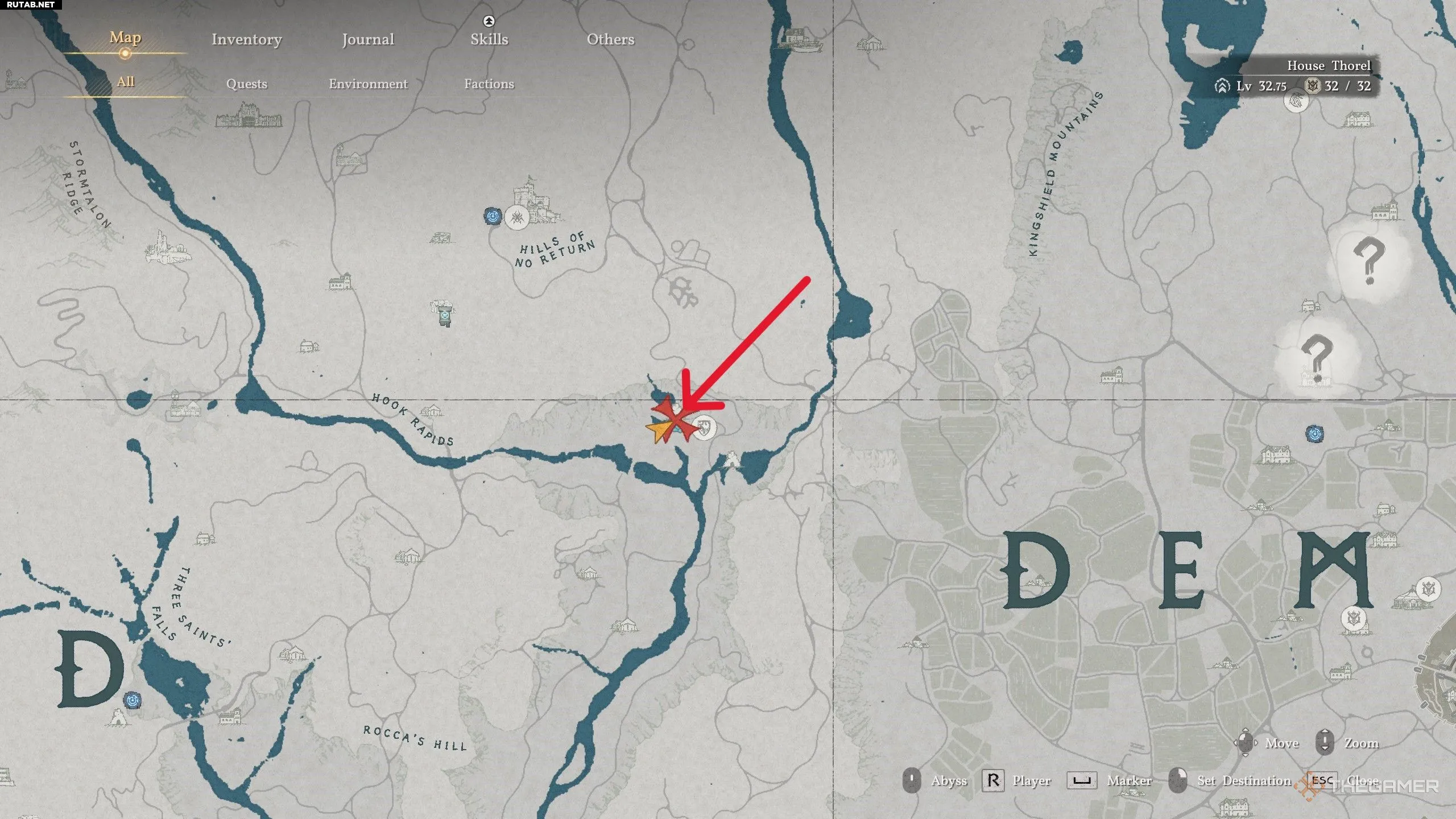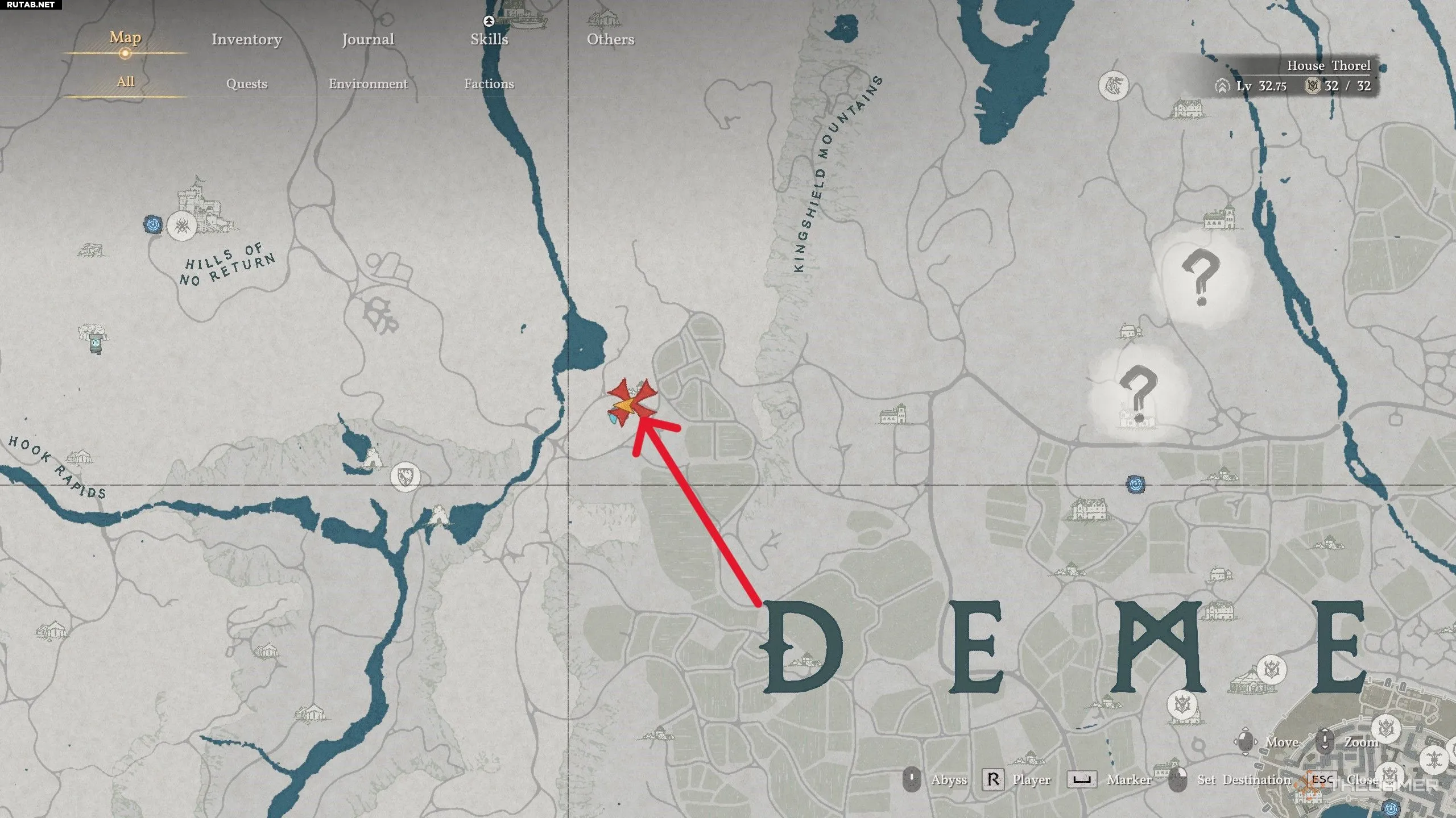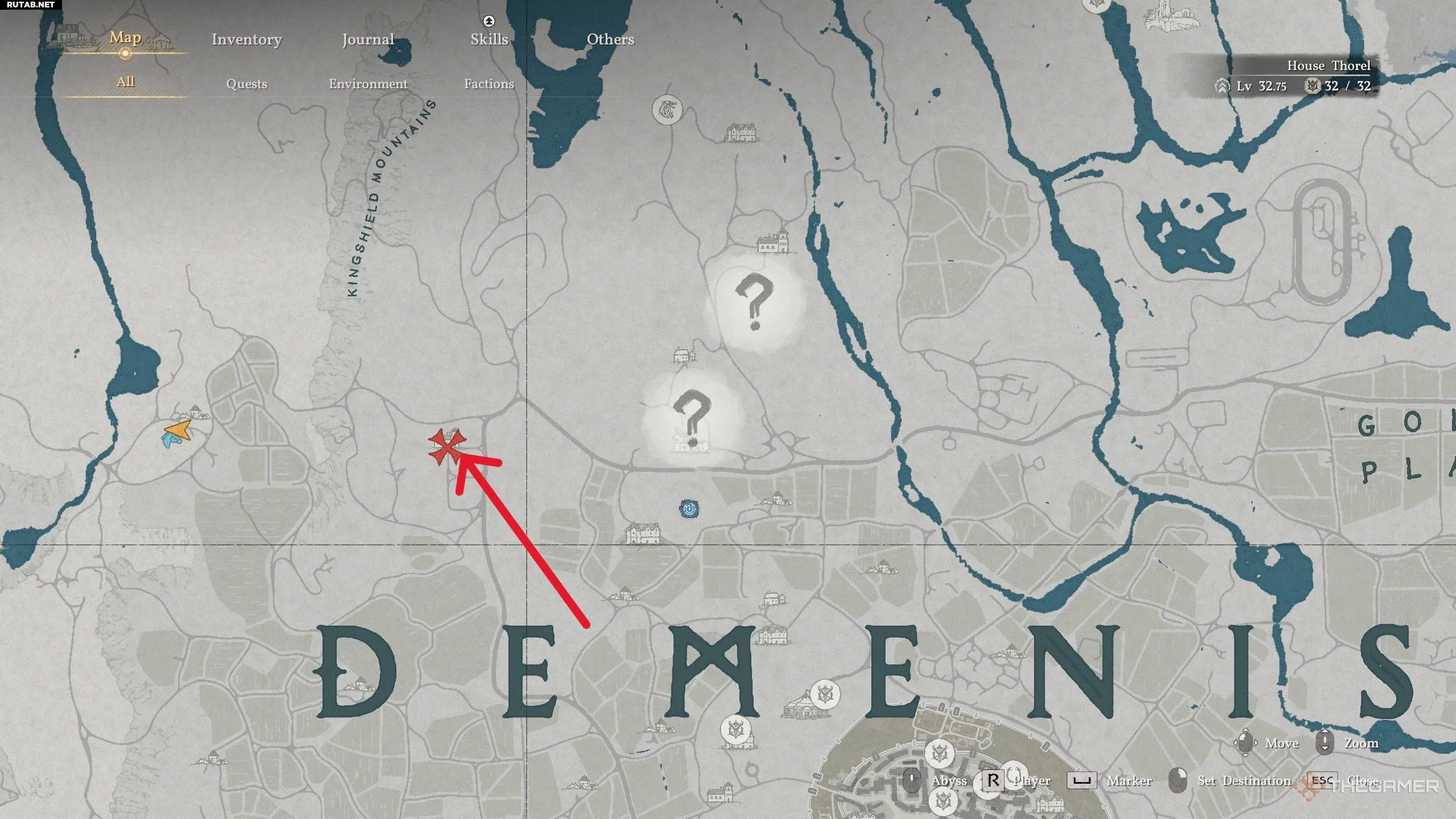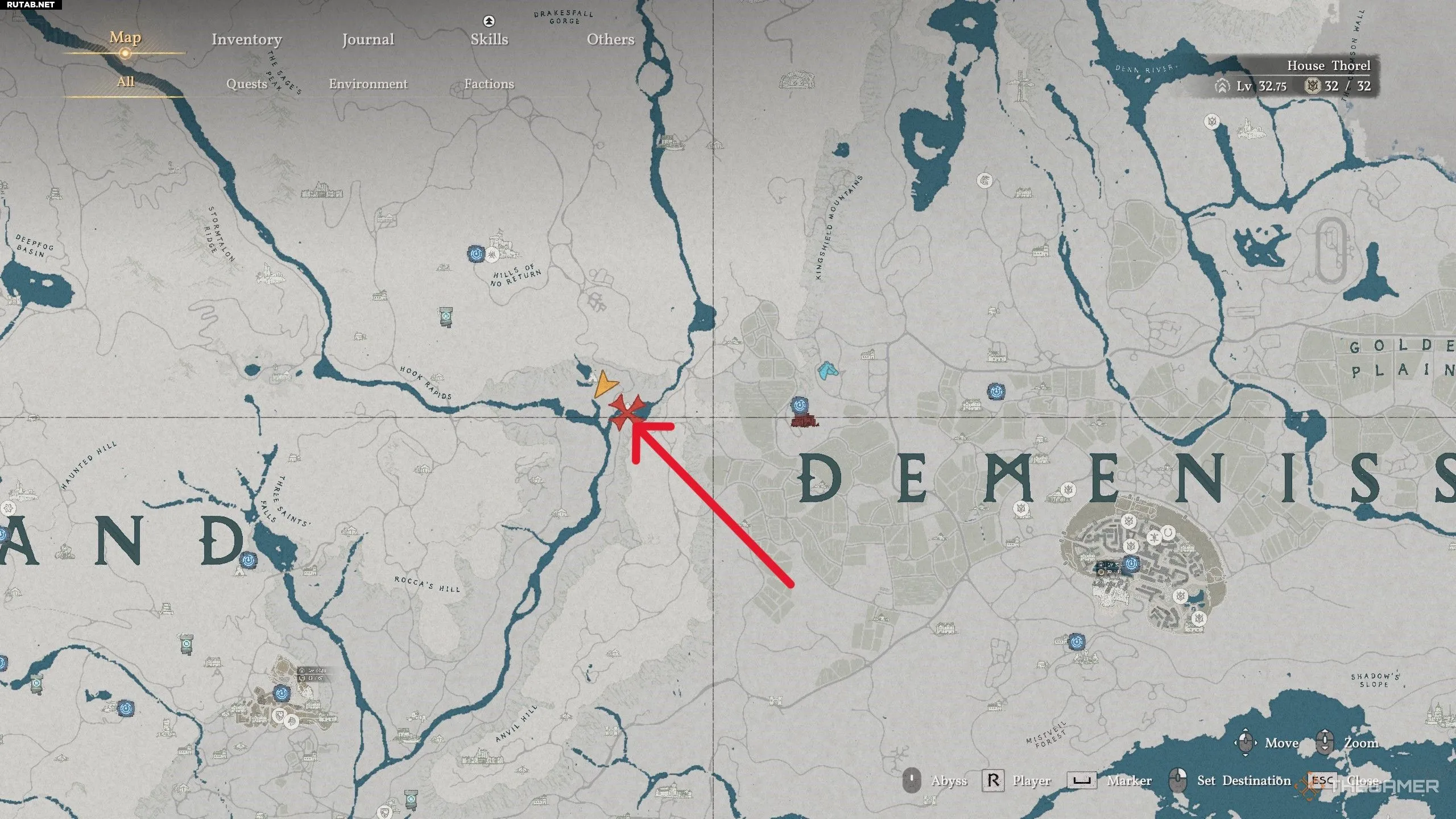 Чтобы найти перчатки, направляйтесь на северо-запад от буквы «D» в названии «Demeniss» на карте. Ищите место, где несколько ручьев сливаются, образуя три водопада (показано выше). Там вы увидите два водопада рядом и один отдельно стоящий. Подойдите к паре водопадов и спрыгните вниз в ущелье, куда они падают.