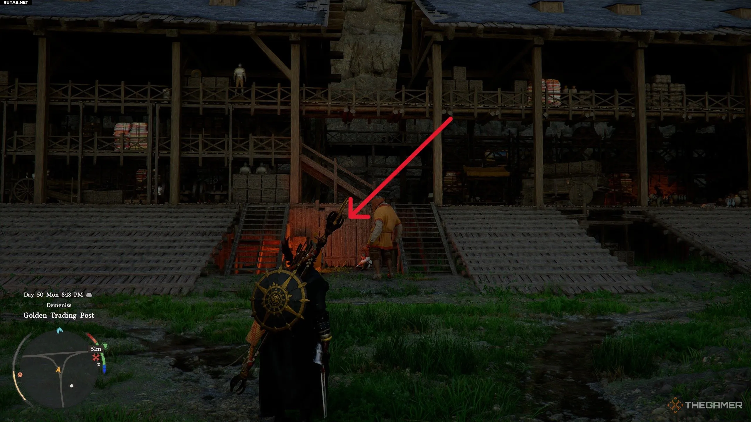 Наконец, отправляйтесь на восток от фермы «Каменный колодец», пока не доберётесь до Золотой биржи. Там вы увидите большое длинное строение, разделённое на несколько этажей. На первом этаже пройдите в середину, где два человека разговаривают с огром, и найдите набор деревянных панелей, похожих на дверь.