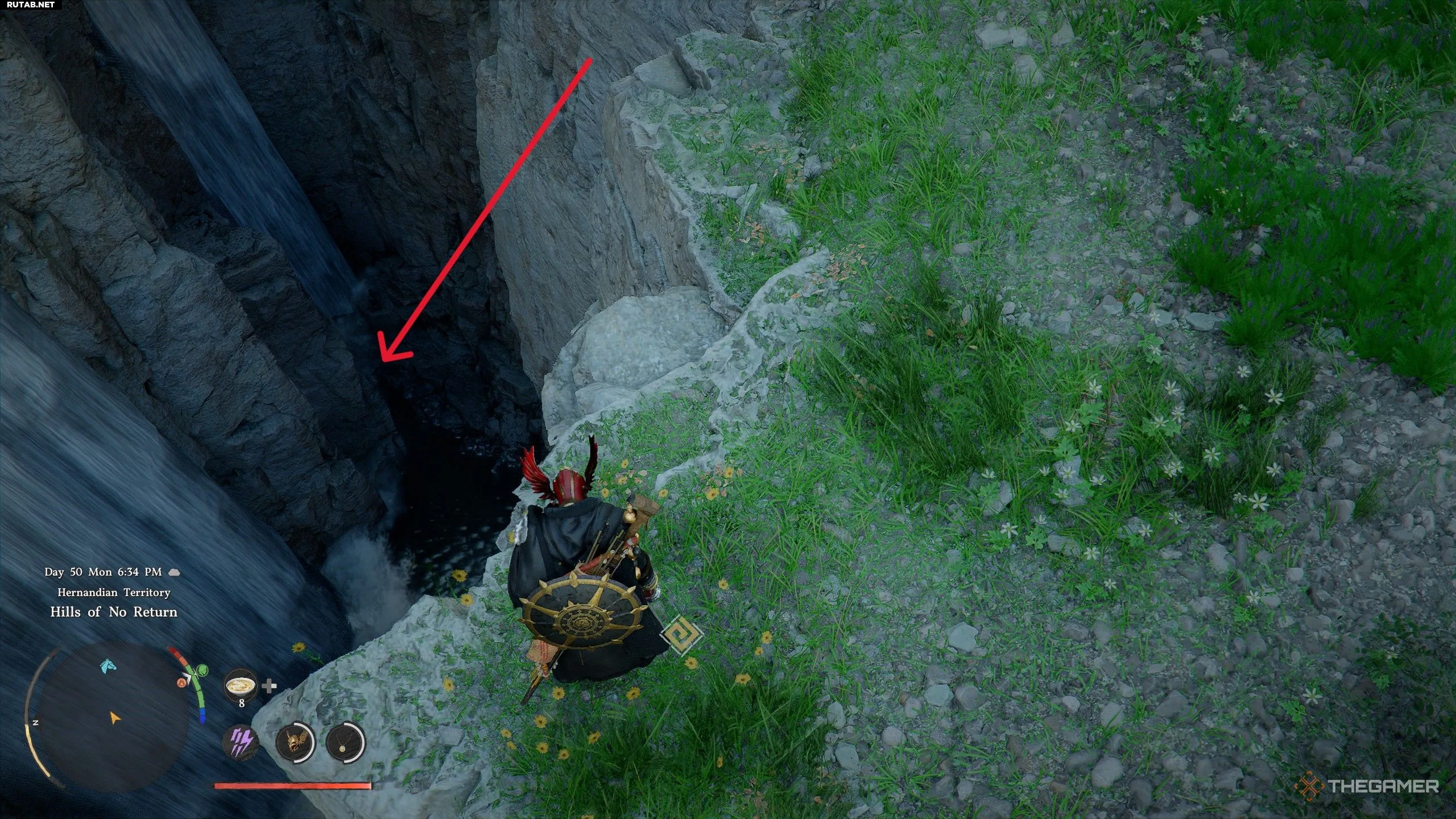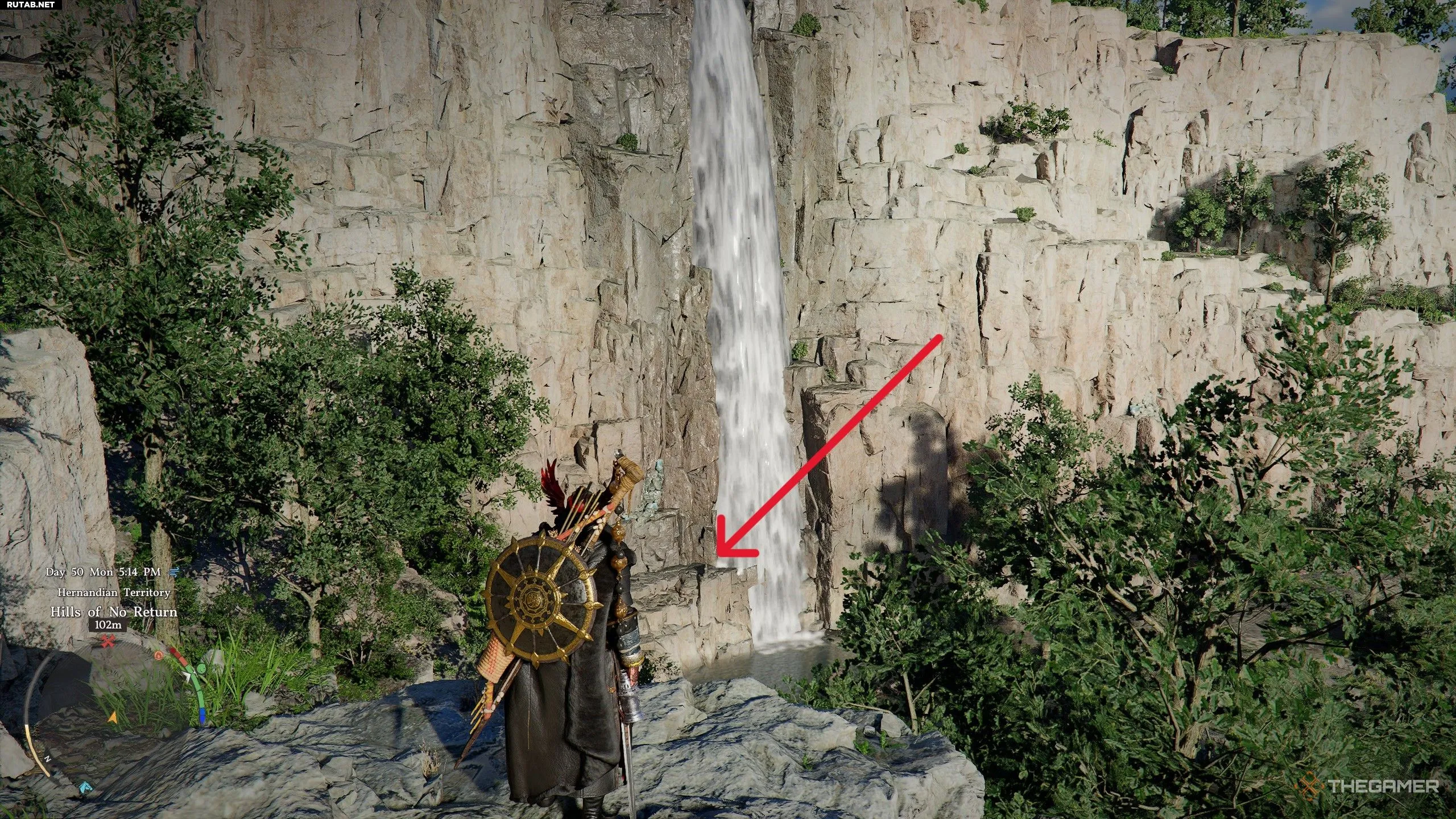 Подойдите к правому водопаду и идите по каменистой тропе, ведущей прямо в бурлящий поток. Выполните колющий удар (Right Trigger + Y на Xbox / Right Trigger + Triangle на PlayStation), чтобы пробиться в пещеру за водопадом. Пройдите по пути, чтобы найти очищенную пальмеровую пилюлю, несколько маленьких сундуков с сокровищами и сундук с латными перчатками испепеляющего пламени.