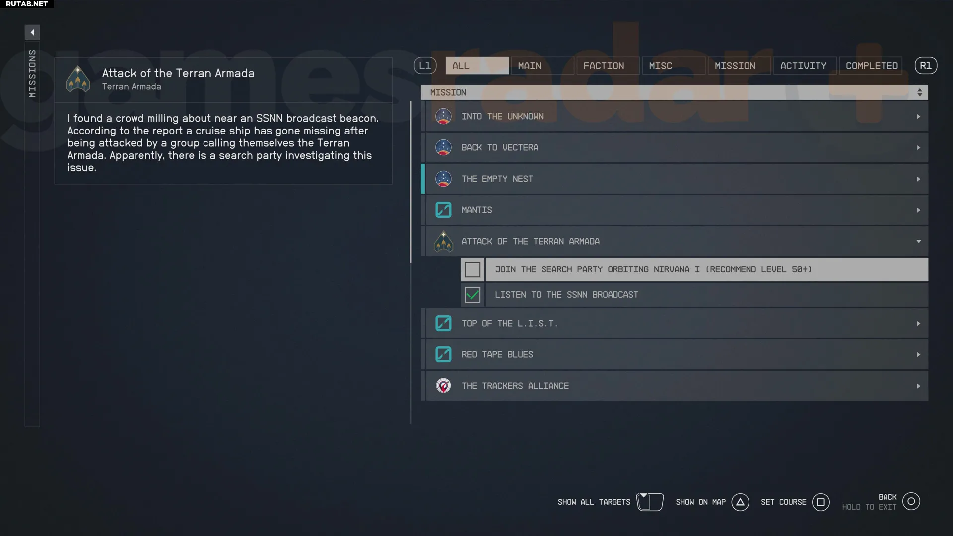 Во время репортажа о пропавшем корабле неизвестный голос провозглашает: «Мы — Терранская Армада. Мы — истинные дети Земли. И никто не встанет у нас на пути». После этого власти обращаются с просьбой ко всем доступным пилотам помочь в поиске выживших. Это добавит в ваш журнал задание «Атака Терранской Армады» с первым шагом «Присоединиться к поисковой группе на орбите Нирваны I».