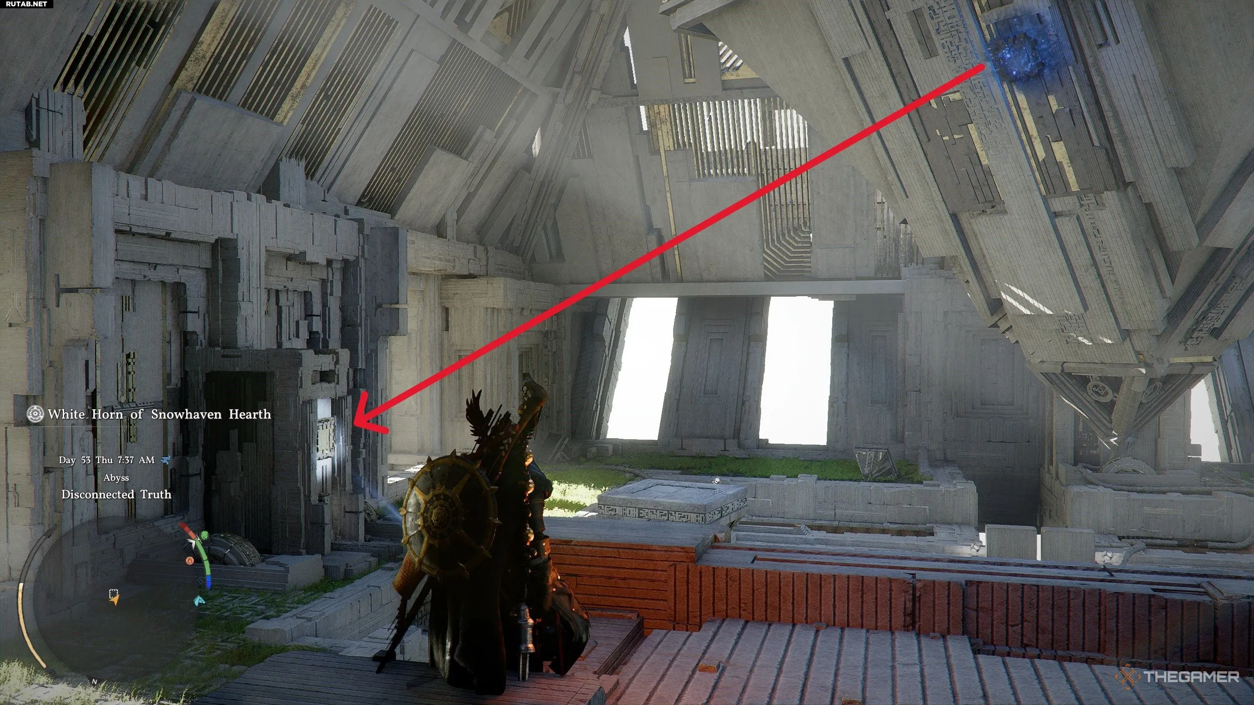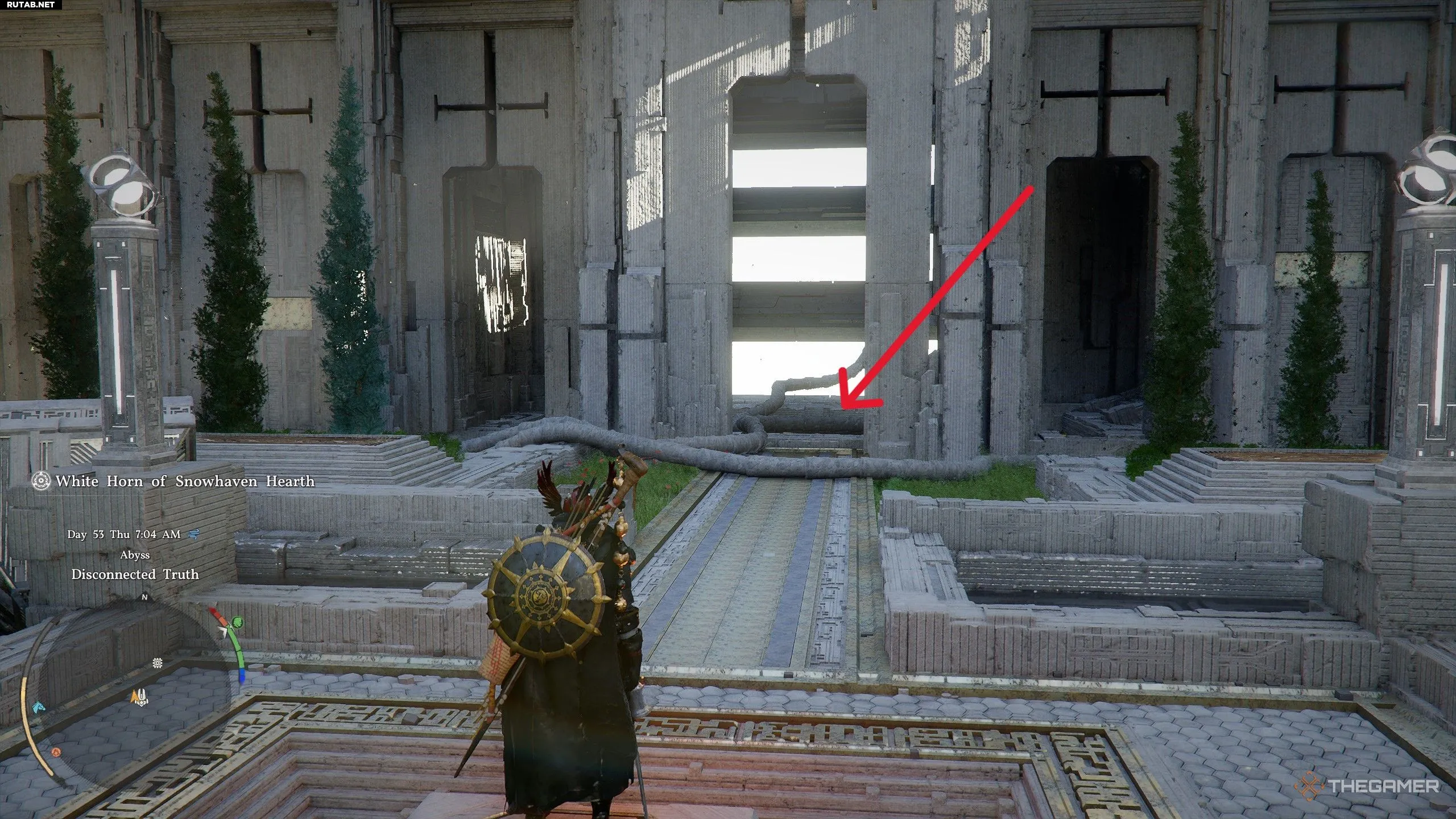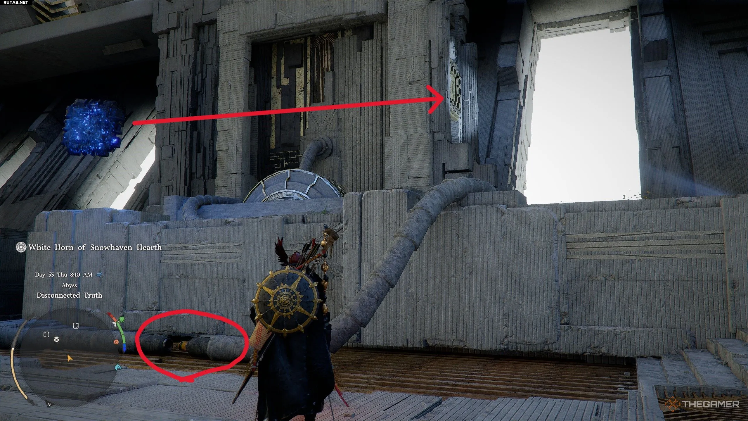 От переключателей на первом этаже на этот раз посмотрите налево, и прямо у выхода из углубления вы увидите на полу трубку, с которой можно взаимодействовать, чтобы соединить обе стороны кабелей. Сделав это, загляните в углубление и используйте Силы аксиомы, чтобы оторвать квадратное ядро Бездны, прикреплённое к колонне.