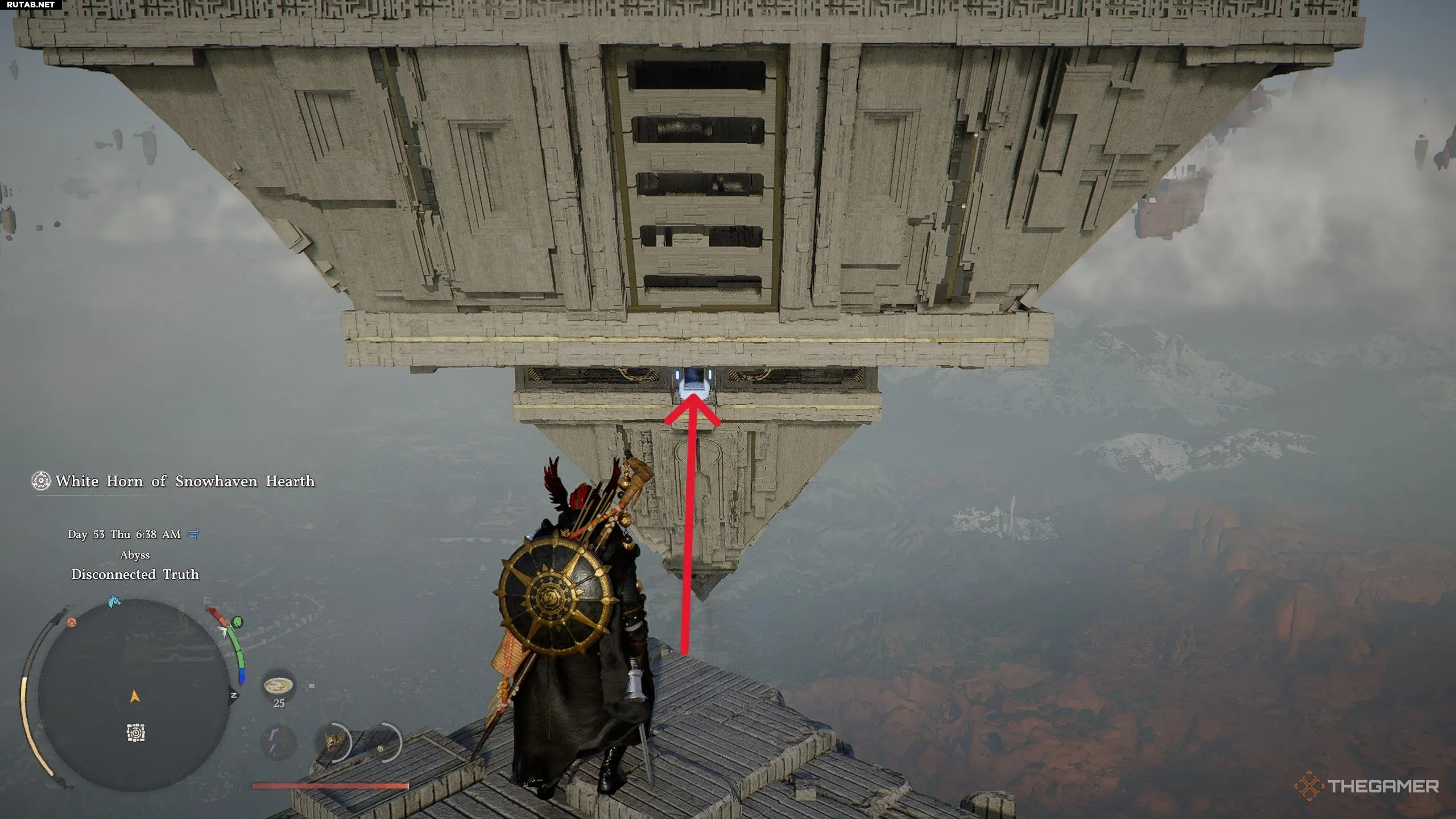 Добравшись до небольшого островка напротив большого алмазообразного острова, активируйте Врата Бездны и подойдите к краю платформы. Внизу вы увидите вентилятор, направленный в сторону острова. Спрыгните с платформы и, пролетая над вентилятором, активируйте планирование, чтобы вас выбросило к небольшому проёму в основании главной конструкции.