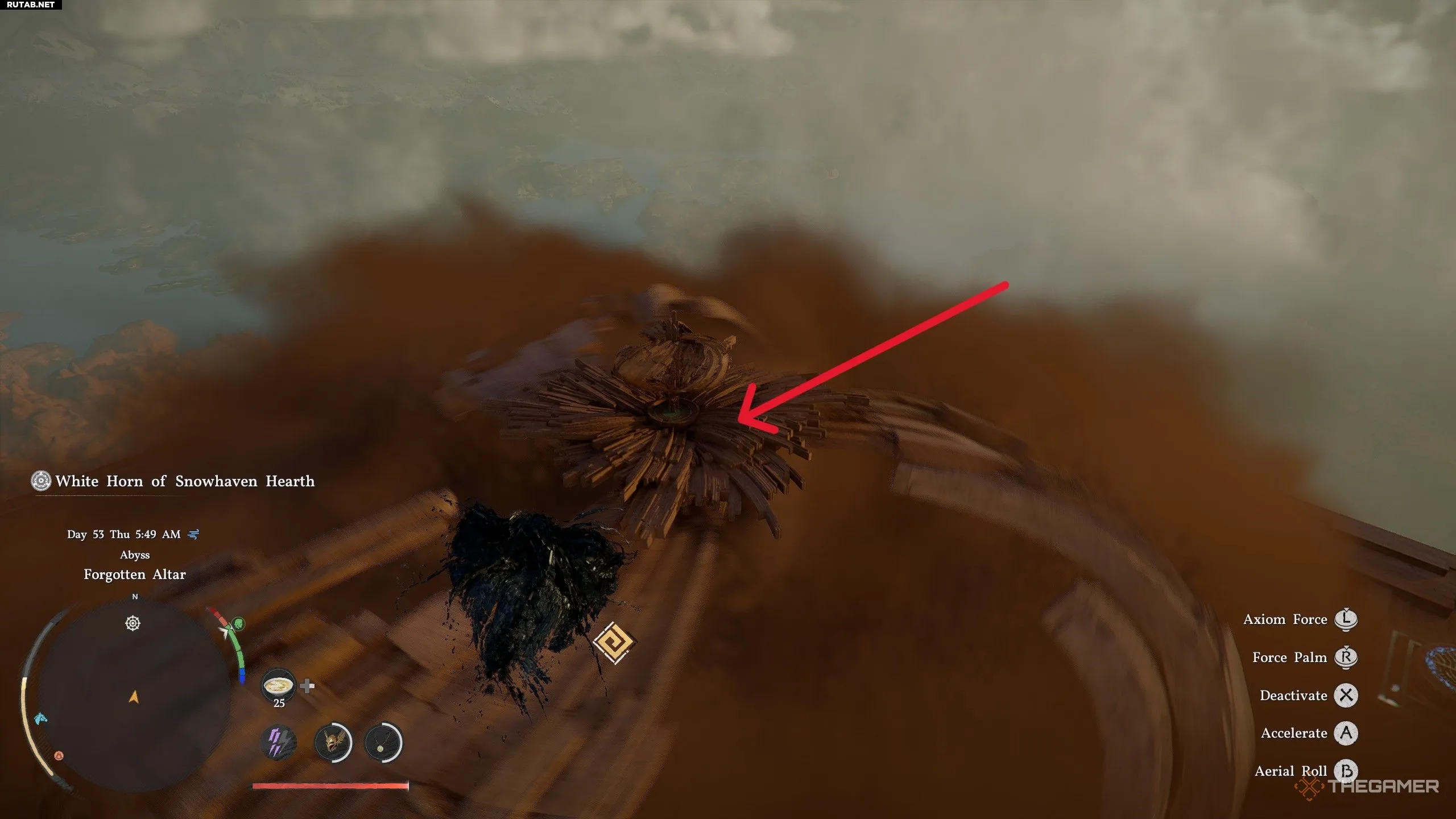 Оказавшись на Забытом Алтаре, идите налево и найдите сферическое Ядро Бездны, лежащее на земле. Поднимите его с помощью Силы аксиомы и поместите на вершину пьедестала прямо над ним (как показано на изображении выше). Вокруг будут колючие кусты, будьте осторожны, чтобы не задеть их, иначе получите урон.