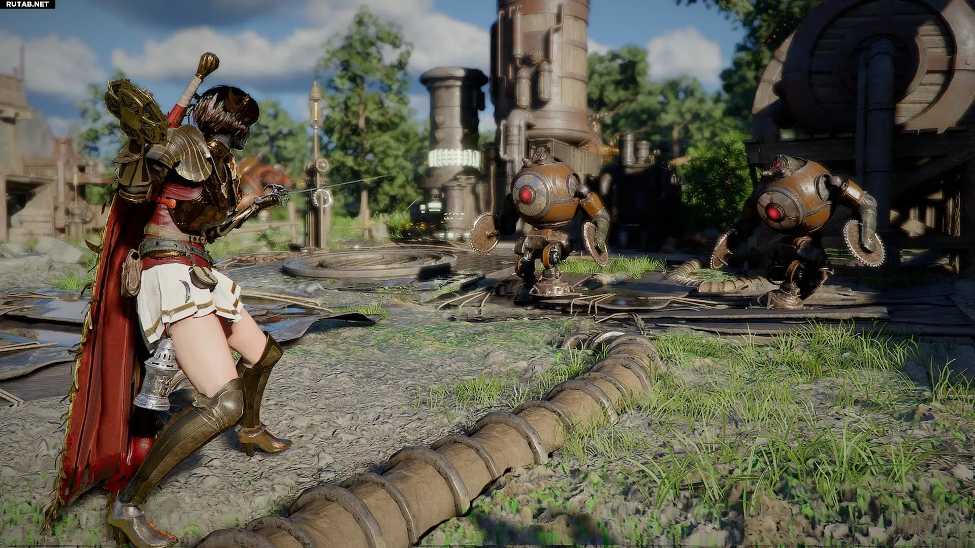 - Роботы очень опасны. Бывают ситуации, когда вам придётся сражаться с двумя или даже тремя большими роботами одновременно. Обязательно используйте против них сильные комбо, а если у вас открыта стихия молнии и навык «Усиление стихий», применяйте заряженные молнией вращающиеся удары, чтобы наносить им огромный урон. Крупные роботы также роняют электрические компоненты, для сбора которых вам понадобятся силы аксиомы и чугунный котёл или сумка Желтоклюва.