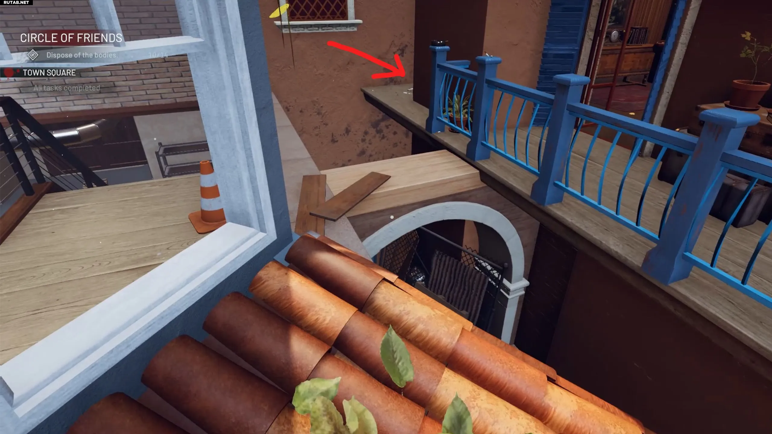 Ковальский окажется на небольшой крыше. Используйте карниз, чтобы пройти к задней части здания, где есть скрытый уголок. Можно аккуратно идти и прыгнуть или перепрыгнуть через синие перила, а затем снова на них забраться, чтобы добраться до цели.