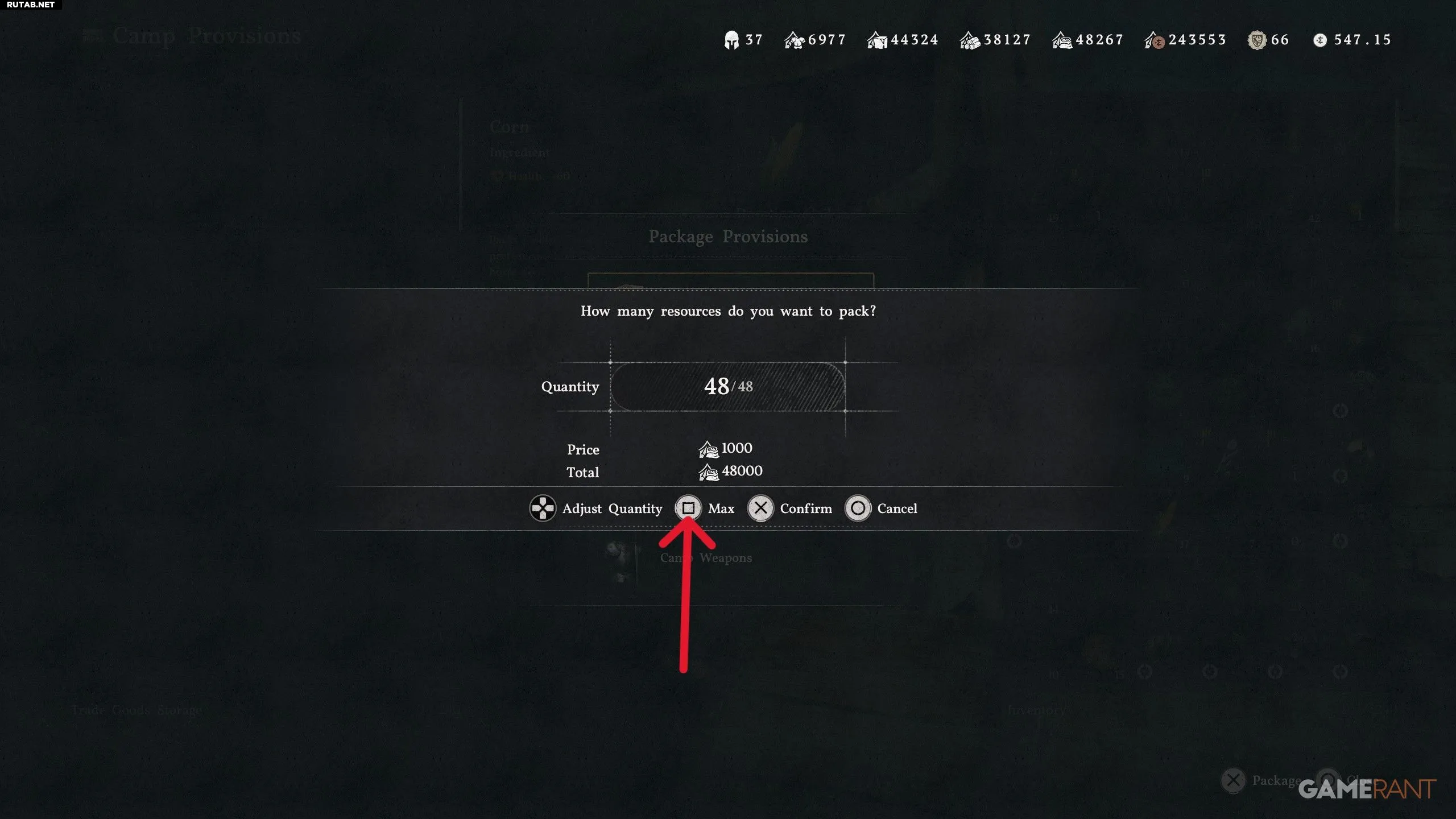 - Нажмите Square/X, чтобы отдать Карло максимальное количество выбранного ресурса.