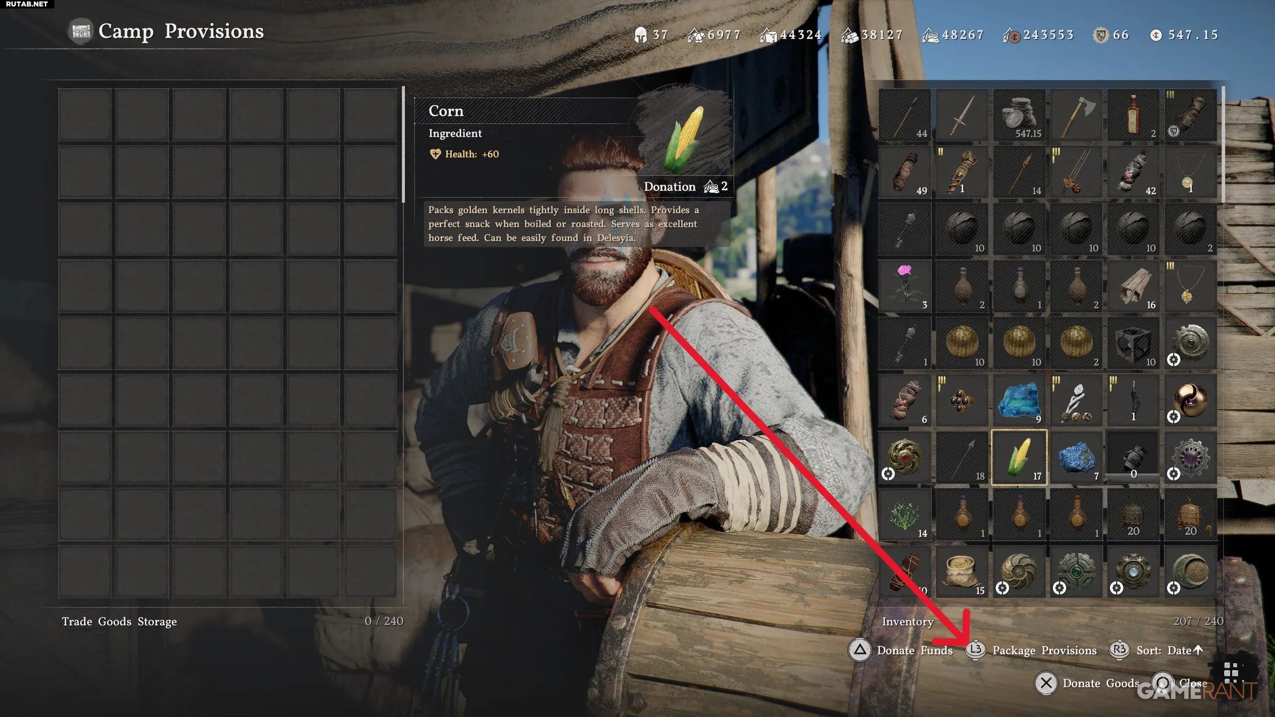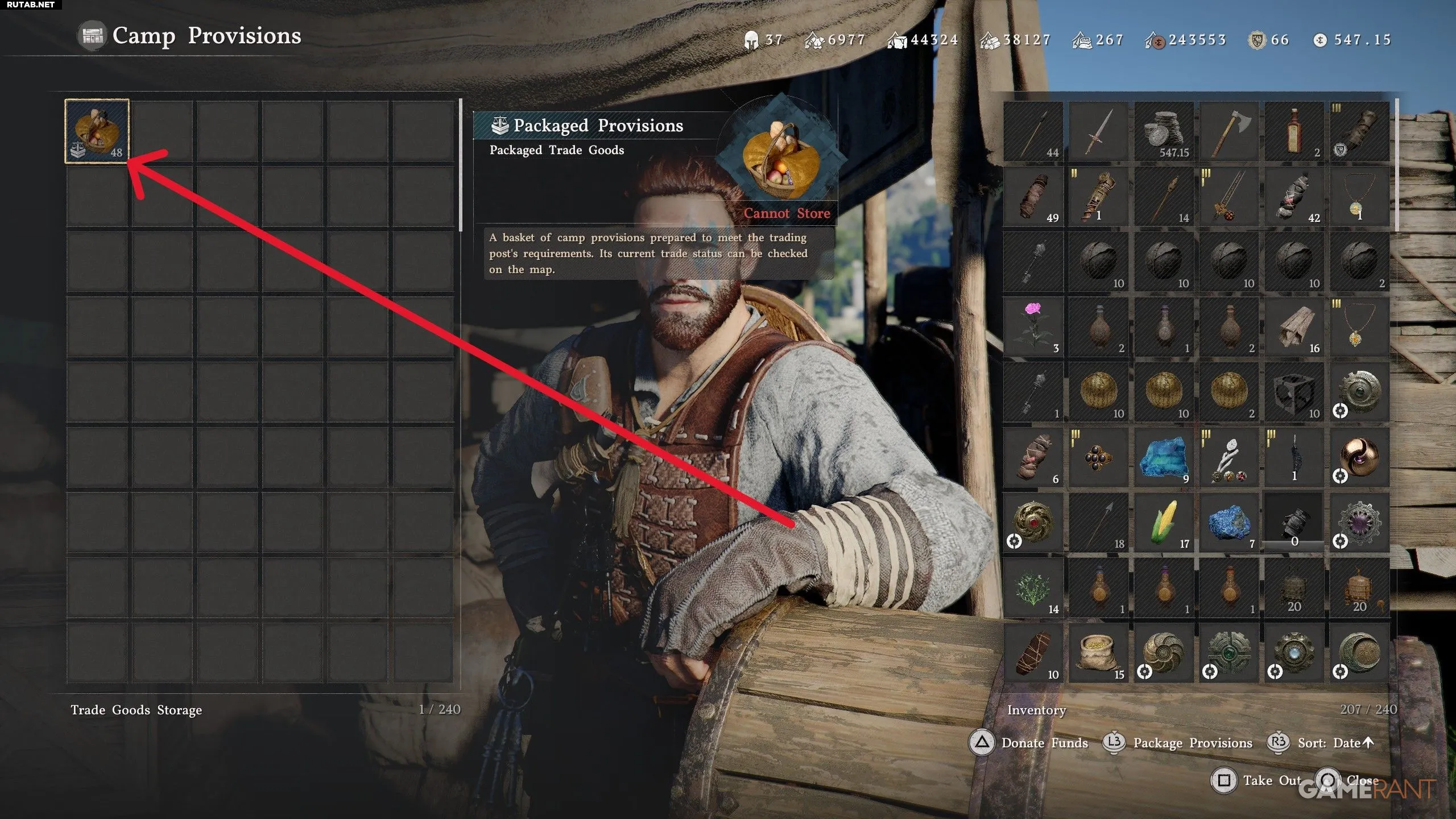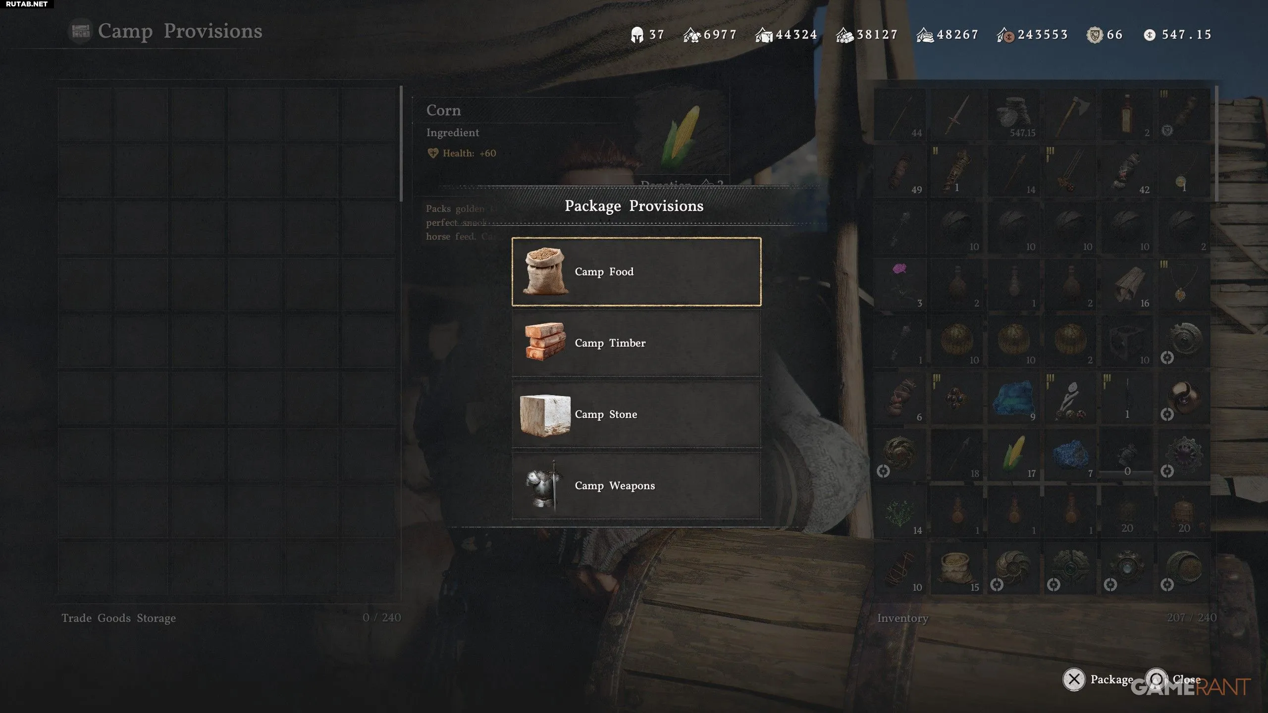- Нажмите L3, чтобы «Упаковать ресурсы лагеря», и выберите «Лагерная еда», «Лагерный лес», «Лагерный камень» или «Лагерное оружие».