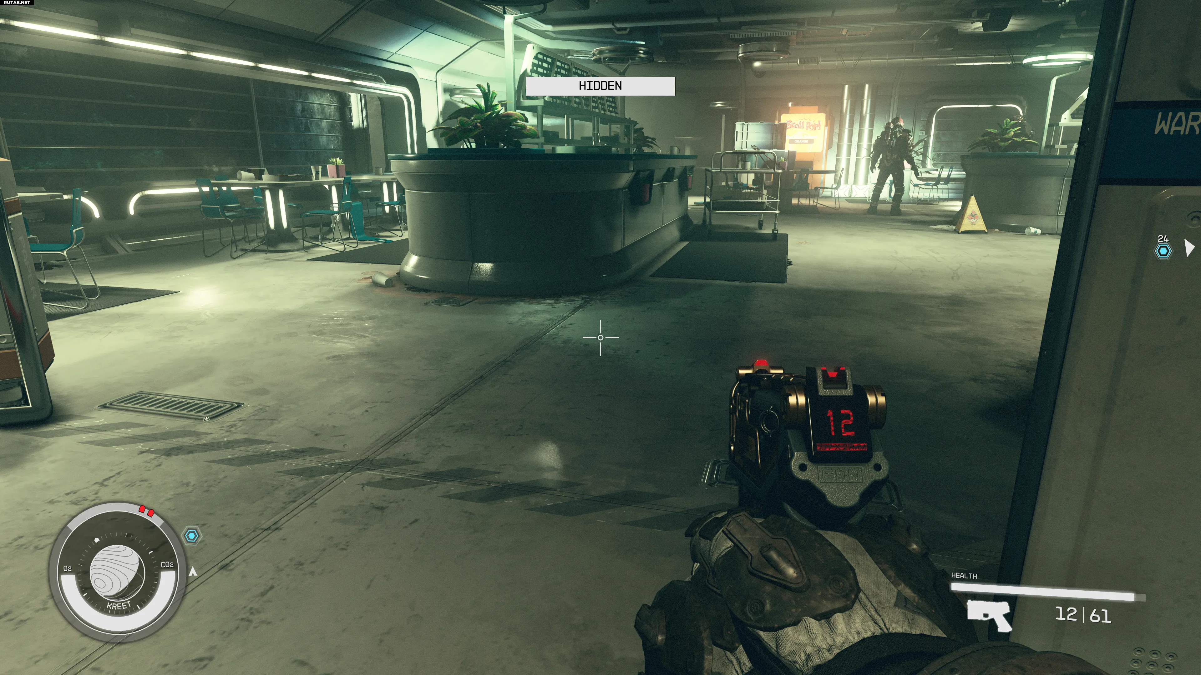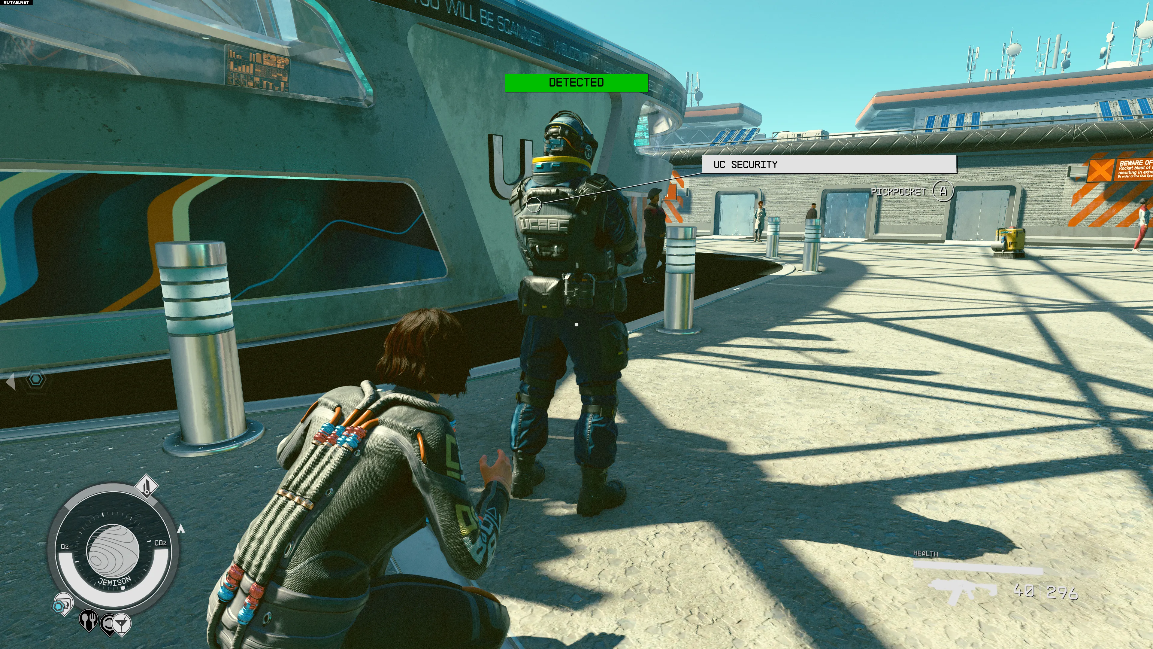 Приседание обязательно при попытке скрытно пройти мимо врагов или подкрасться к ним. Когда игрок приседает, в верхней части экрана появляется шкала, показывающая текущий статус обнаружения. Если она белая и отображает «СКРЫТ», значит, персонаж остаётся незамеченным для окружающих.
