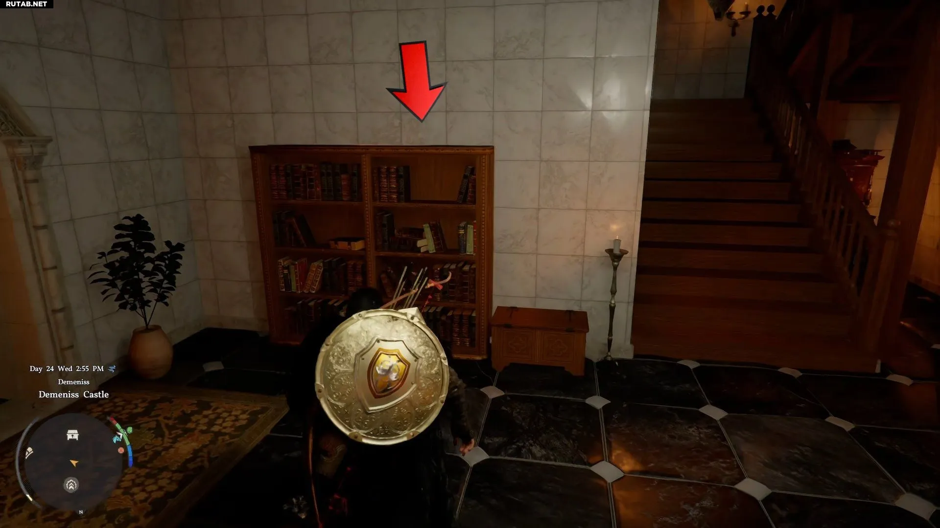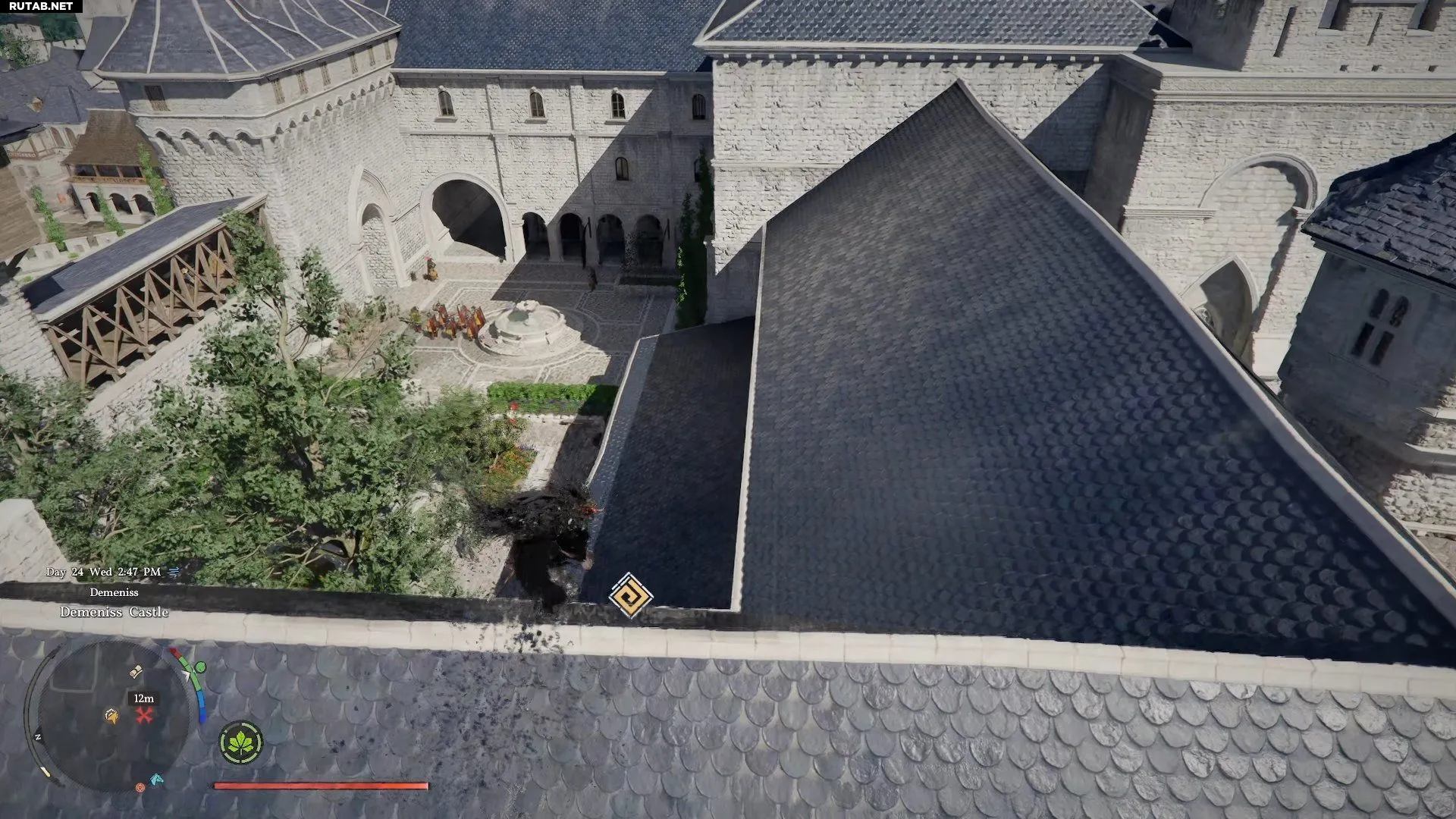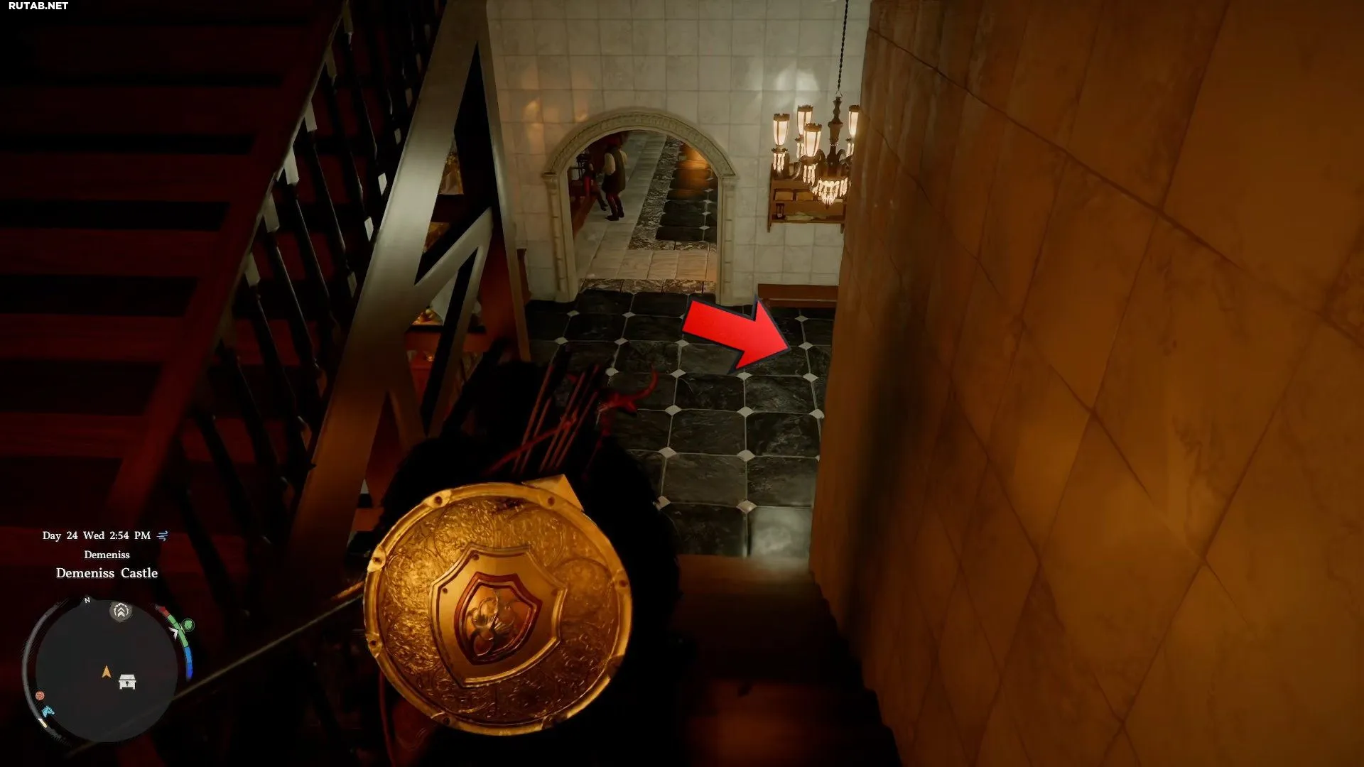 - Поднимитесь на стену замка с западной стороны, чтобы попасть на зубчатые стены.